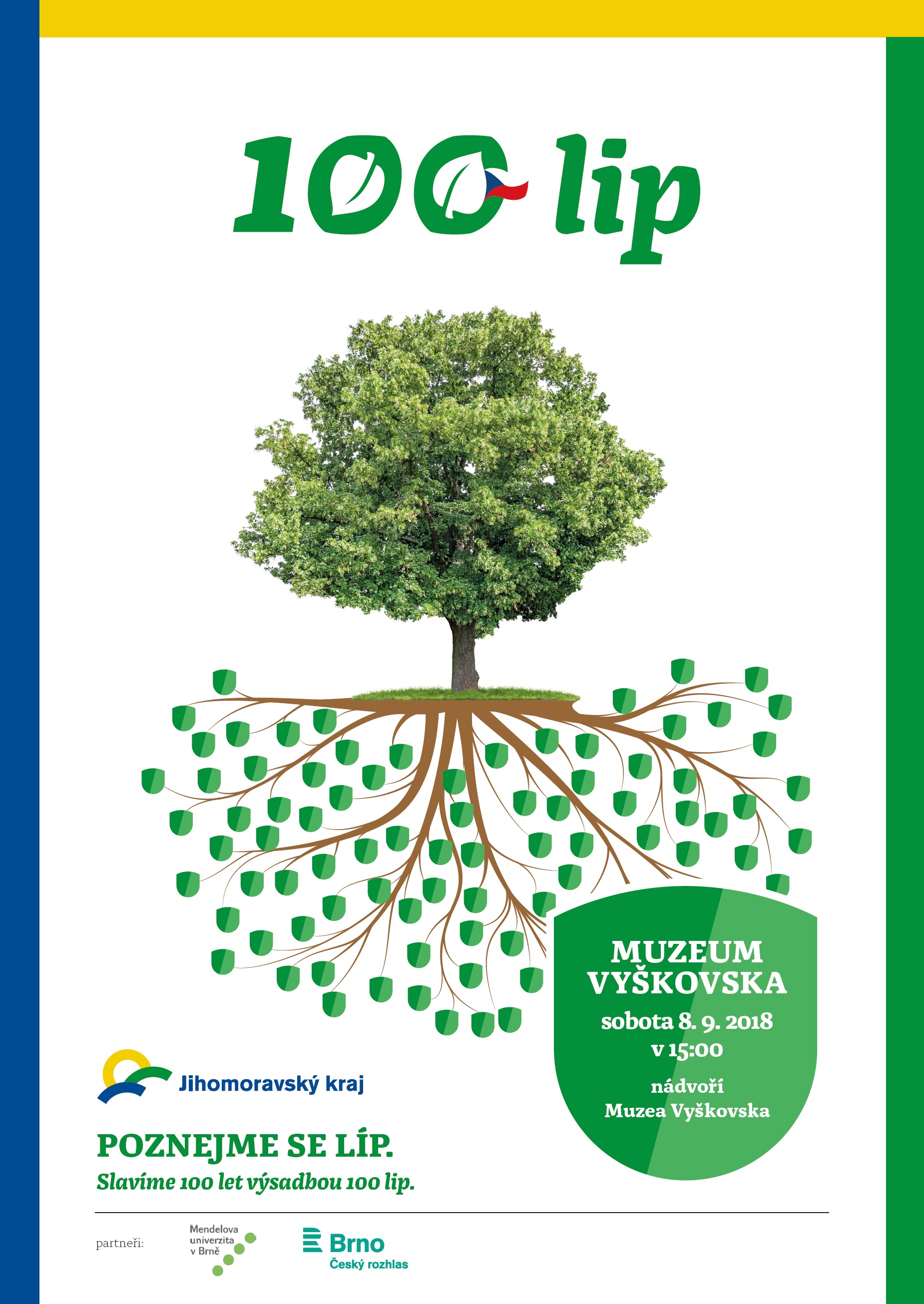 V letošním roce si Česká republika připomíná 100. výročí vzniku československé státnosti. Jihomoravský kraj chce v této souvislosti na stovce vybraných míst jižní Moravy vysadit 100 lip srdčitých jako připomínku této historické události. Lípy jsou symboly demokracie, ale také lidské pospolitosti a hrdosti. Byly to právě lípy, které byly vysazovány v roce 1928 k desetiletému výročí republiky, ve stoleté historii to byly právě lípy, pod nimiž se lidé setkávali, a právě lípy budou svědky i setkání příštích. Buďte u toho společně s námi.
