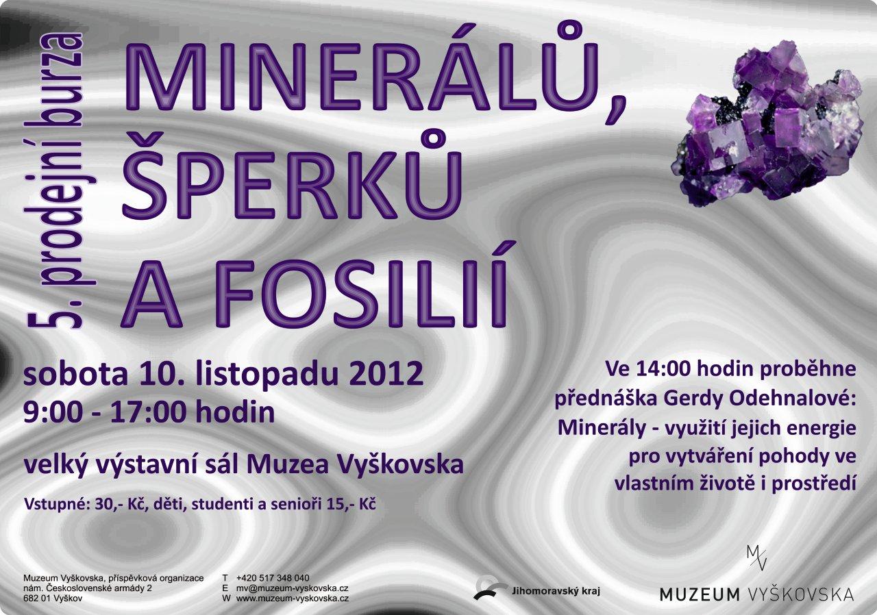 Již pátý ročník prodejní burzy minerálů, šperků a fosilií se uskuteční v sobotu 10. listopadu 2012 od 9:00 do 17:00 hodin ve velkém výstavním sále Muzea Vyškovska.