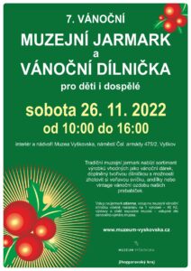 Zveme Vás na tradiční muzejní jarmark spojený s vánoční dílničkou pro děti i dospělé. Jarmark nabízí sortiment výrobků vhodných jako vánoční dárek, doplněný tvořivou dílničkou s možností zhotovit si voňavou svíčku, andílky nebo vintage vánoční ozdobu našich prababiček.