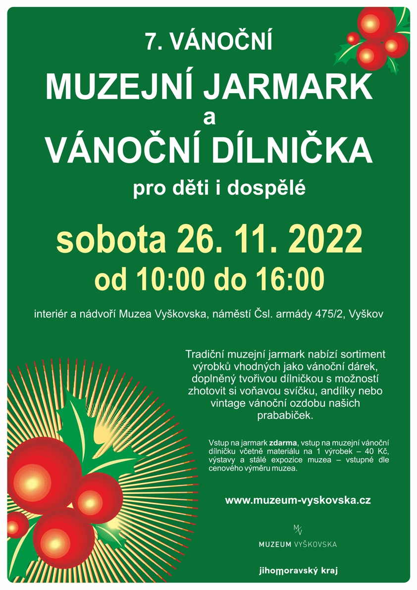 Zveme Vás na tradiční muzejní jarmark spojený s vánoční dílničkou pro děti i dospělé. Jarmark nabízí sortiment výrobků vhodných jako vánoční dárek, doplněný tvořivou dílničkou s možností zhotovit si voňavou svíčku, andílky nebo vintage vánoční ozdobu našich prababiček.