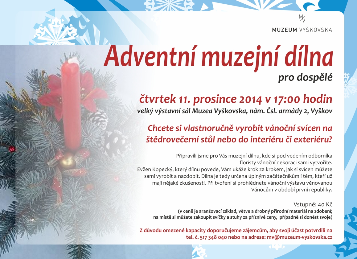 Tak právě pro Vás jsme připravili muzejní dílnu, kde si pod vedením odborníka floristy vánoční dekoraci sami vytvoříte. Zahradník ze zámku v Rájci nad Svitavou Evžen Kopecký, který dílnu povede, Vám ukáže krok za krokem, jak si svícen můžete sami vyrobit a nazdobit. Dílna je tedy určena úplným začátečníkům i těm, kteří už mají nějaké zkušenosti. Při tvoření si prohlédnete vánoční výstavu věnovanou Vánocům v období první republiky.