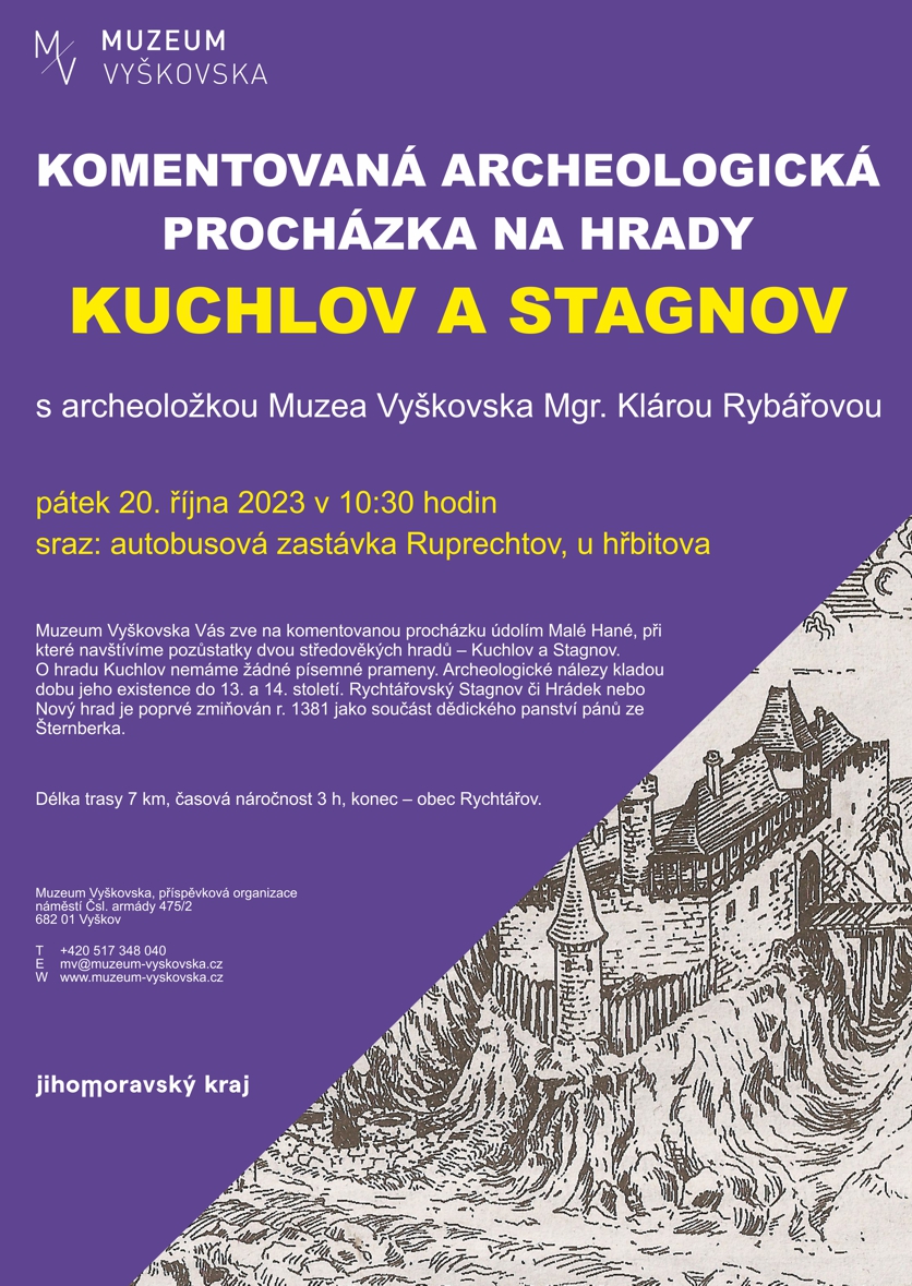 Muzeum Vyškovska Vás zve na komentovanou procházku údolím Malé Hané, při které navštívíme pozůstatky dvou středověkých hradů – Kuchlov a Stagnov. O hradu Kuchlov nemáme žádné písemné prameny. Archeologické nálezy kladou dobu jeho existence do 13. a 14. století. Rychtářovský Stagnov či Hrádek nebo Nový hrad je poprvé zmiňován r. 1381 jako součást dědického panství pánů ze Šternberka.