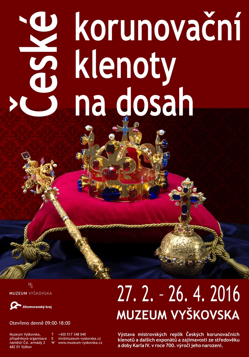 České korunovační klenoty by měl prý každý Čech spatřit alespoň jednou za život. Originály uložené v trezoru v katedrále sv. Víta v Praze bývají vystavovány vždy jen na pár dní při různých významných výročích a událostech. Ne každému se podaří těchto sporadických příležitostí využít. Putovní výstava, jejímž hlavním exponátem jsou mistrovské repliky nejvýznamnějších symbolů české státnosti, je možností, které může využít téměř každý, a to od 27. února do 26. dubna 2016 v Muzeu Vyškovska.