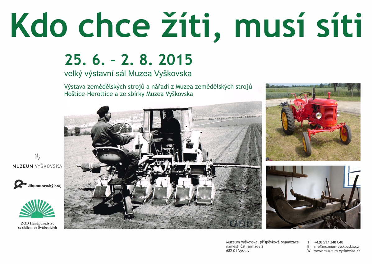 Výstava zemědělských strojů a nářadí z Muzea zemědělských strojů v Hošticích-Herolticích a ze sbírky Muzea Vyškovska.