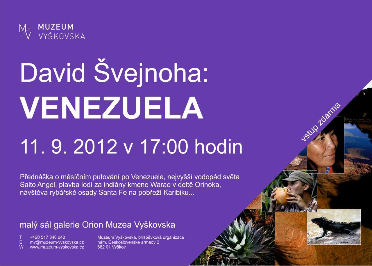 Přednáška Davida Švejnohy o měsíčním putování po Venezuele, které začíná výhledy na nejvyšší vodopád světa Salto Angel, pětidenní náročný trek na stolovou horu Roraimu, třídenní cesta lodí za indiány kmene Warao v delně Orinoka, rybářská osada Santa Fe na pobřeží Karibiku, zajímavá plavba po řece Caura za vodopády Paraa, domorodé indiánské vesnice kmene Sanema, nekonečné pláně Los Llanos plných kajmanů, kapibar a stovek druhů ptáků. Horské rušné město Merida a tůra do vesnice Los Nevados. Historické město Coro a zasloužený odpočinek na přeplněných plážích městečka Choroní.