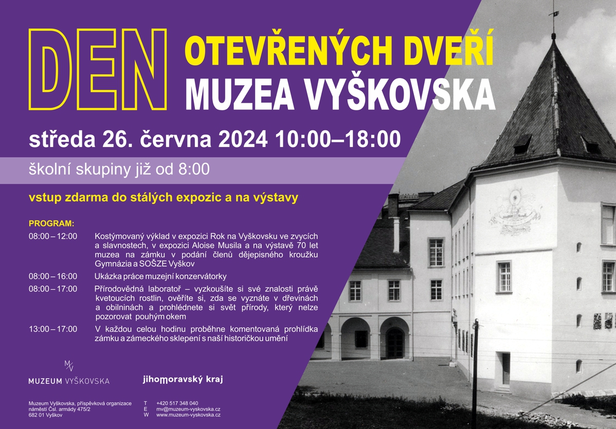 Srdečně Vás opět zveme na Den otevřených dveří Muzea Vyškovska, kde si můžete zdarma individuálně prohlédnout otevřené stálé expozice a právě probíhající výstavy nebo absolvovat v odpoledních hodinách komentovanou prohlídku zámku a zámeckého sklepení s naší historičkou umění.