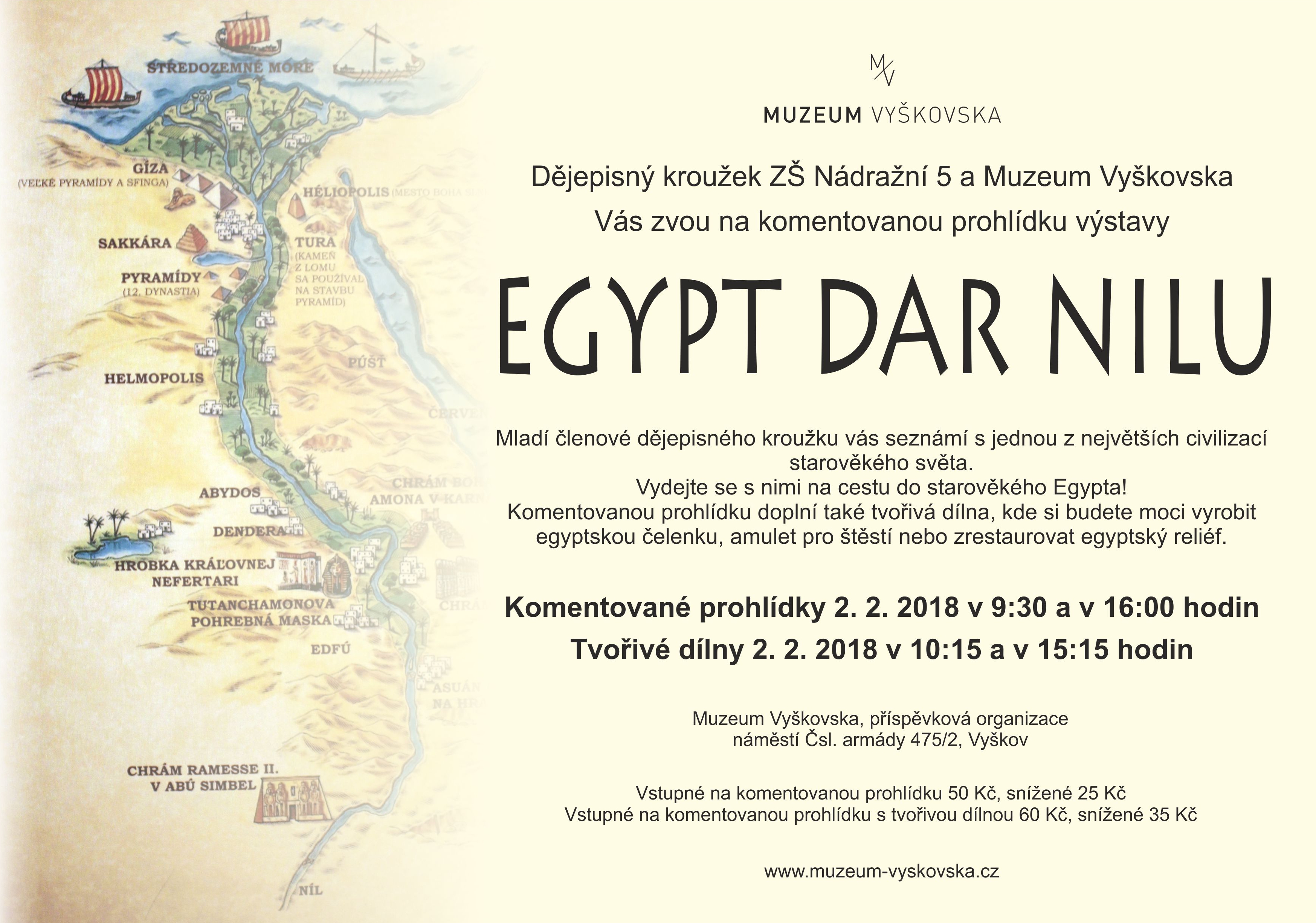 Dějepisný kroužek ZŠ Nádražní 5 a Muzeum Vyškovska vás zvou na komentovanou prohlídku výstavy Egypt dar Nilu.