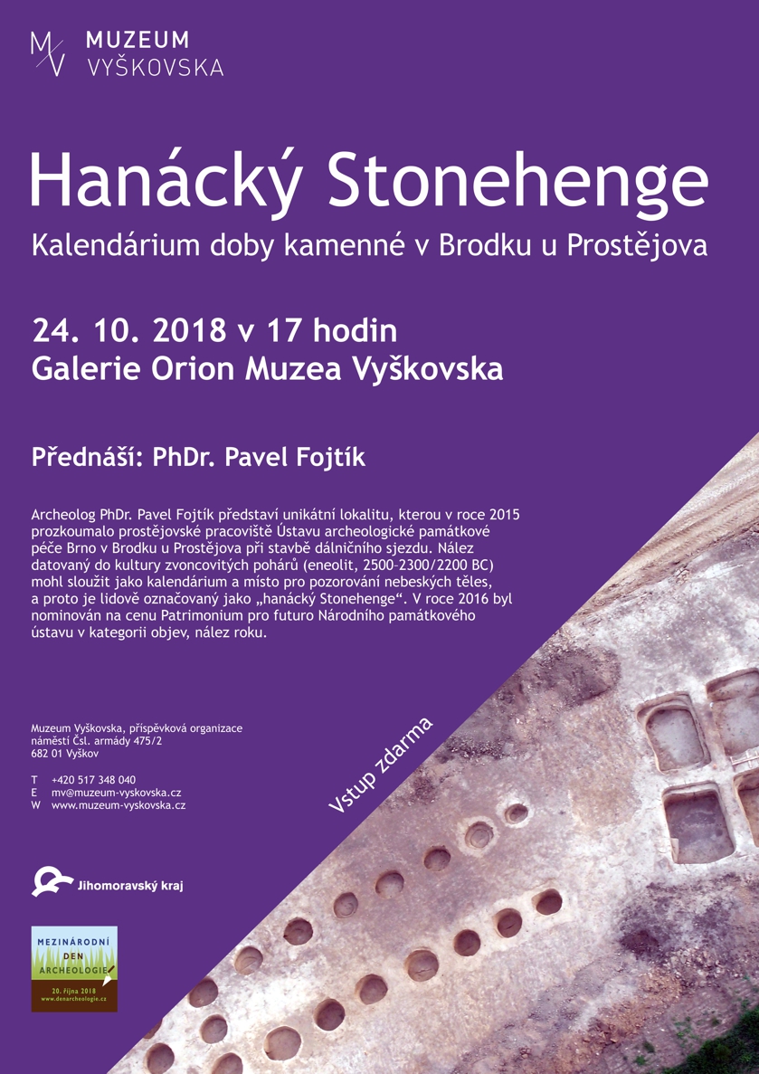 Archeolog PhDr. Pavel Fojtík představí unikátní lokalitu, kterou v roce 2015 prozkoumalo prostějovské pracoviště Ústavu archeologické památkové péče Brno v Brodku u Prostějova při stavbě dálničního sjezdu. Nález datovaný do kultury zvoncovitých pohárů (eneolit, 2500–2300/2200 BC) mohl sloužit jako kalendárium a místo pro pozorování nebeských těles, a proto je lidově označovaný jako „hanácký Stonehenge“. V roce 2016 byl nominován na cenu Patrimonium pro futuro Národního památkového ústavu v kategorii objev, nález roku.