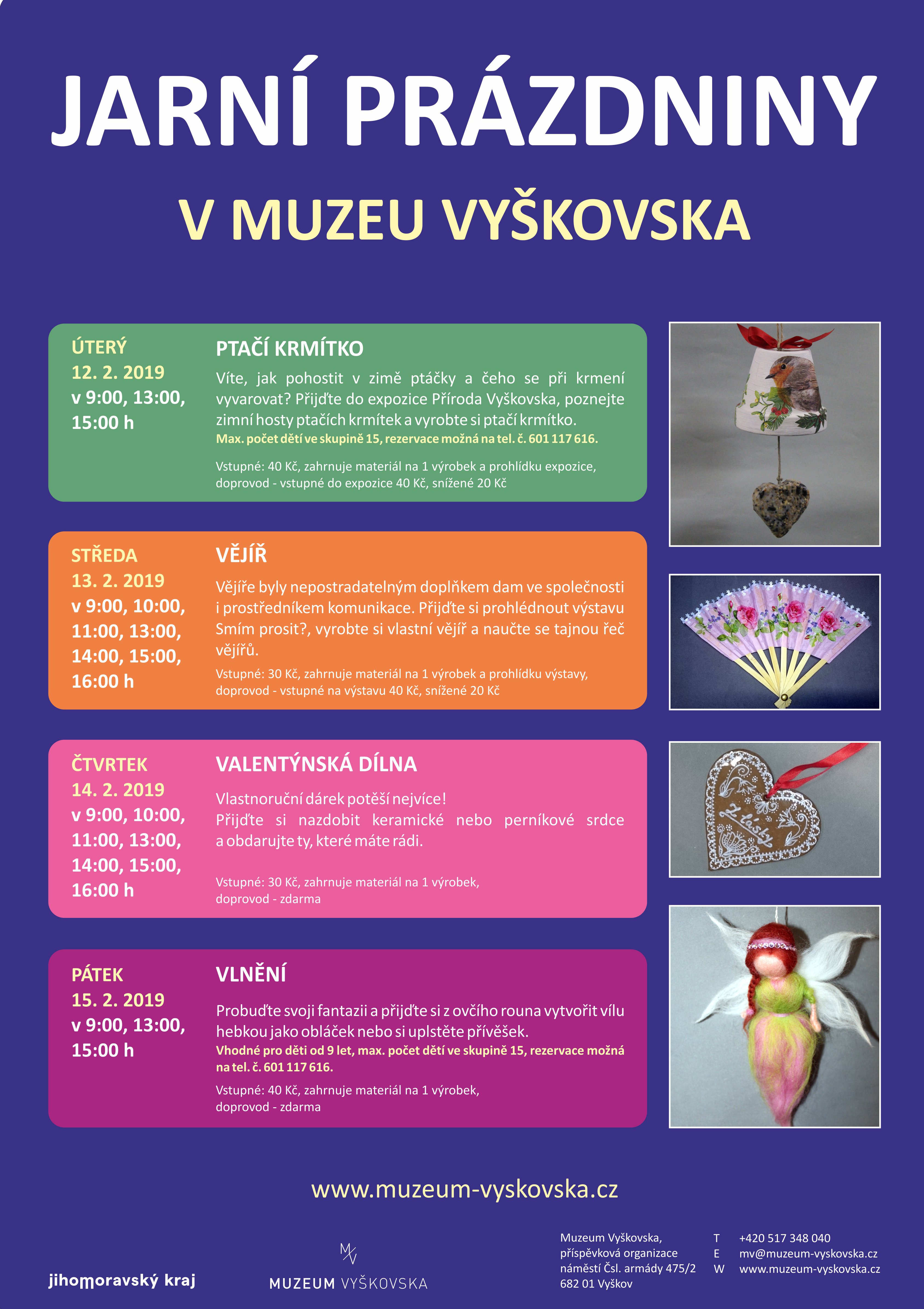 Vstupné: 40 Kč, zahrnuje materiál na 1 výrobek a prohlídku expozice, doprovod – vstupné do expozice 40 Kč, snížené 20 Kč
