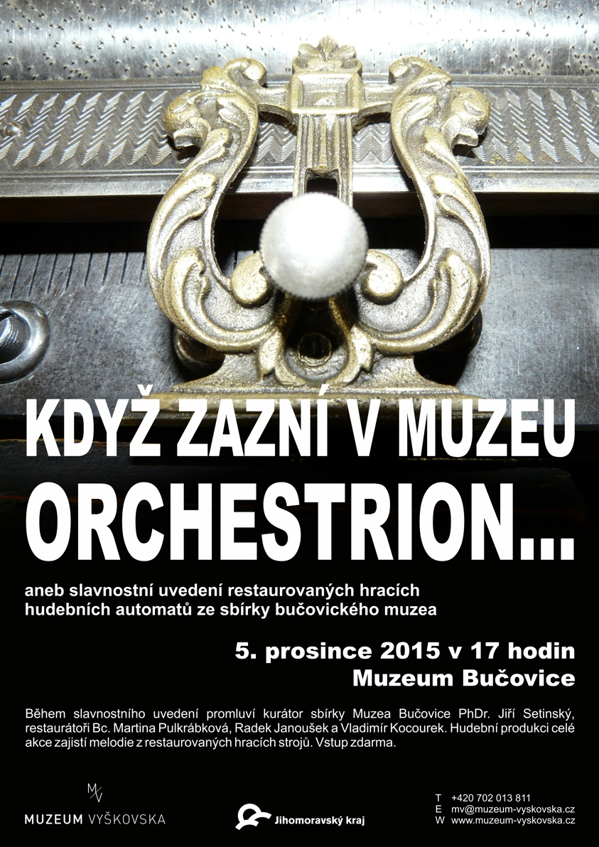 Muzeum Vyškovska, detašované pracoviště Muzeum Bučovice, pořádá akci, při níž budou slavnostně uvedeny restaurované hudební mechanické nástroje z bučovické muzejní sbírky. Jedná se o unikátní hřebíčkový hrací stroj firmy „Gustav Schömig“ z Vídně a orchestrion značky „Hynek Klepetář“ z Prahy.
