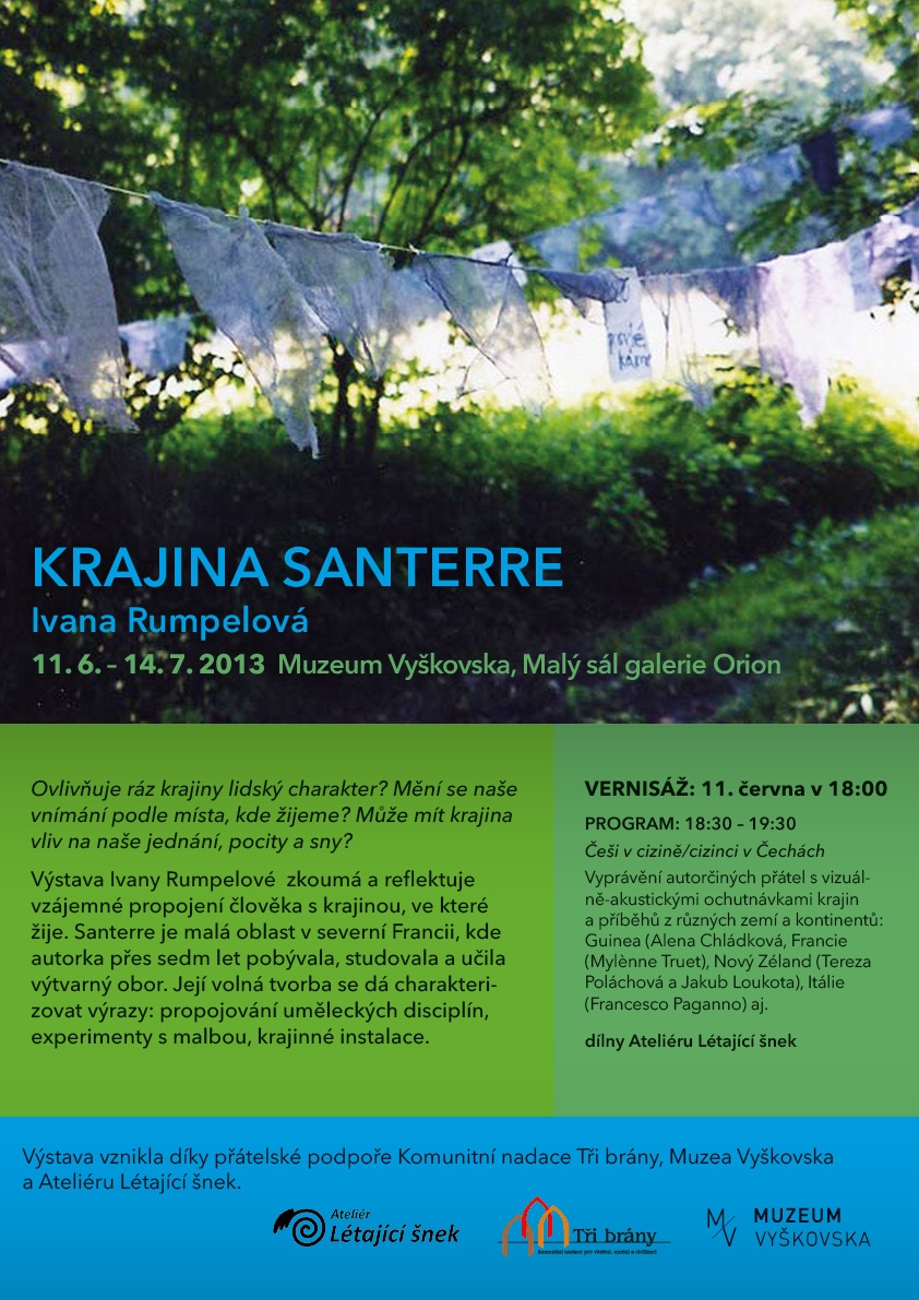 Výstava Ivany Rumpelové zkoumá a reflektuje vzájemné propojení člověka s krajinou, ve které žije. Santerre je malá oblast v severní Francii, kde autorka přes sedm let pobývala, studovala a učila výtvarný obor. Její volná tvorba se dá charakterizovat výrazy: propojování uměleckých disciplín, experimenty s malbou, krajinné instalace.