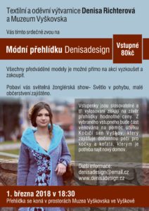 Textilní a oděvní výtvarnice Denisa Richterová Vás srdečně zve na svoji módní přehlídku do Muzea Vyškovska. Všechny předváděné modely je možné přímo na akci vyzkoušet a zakoupit.