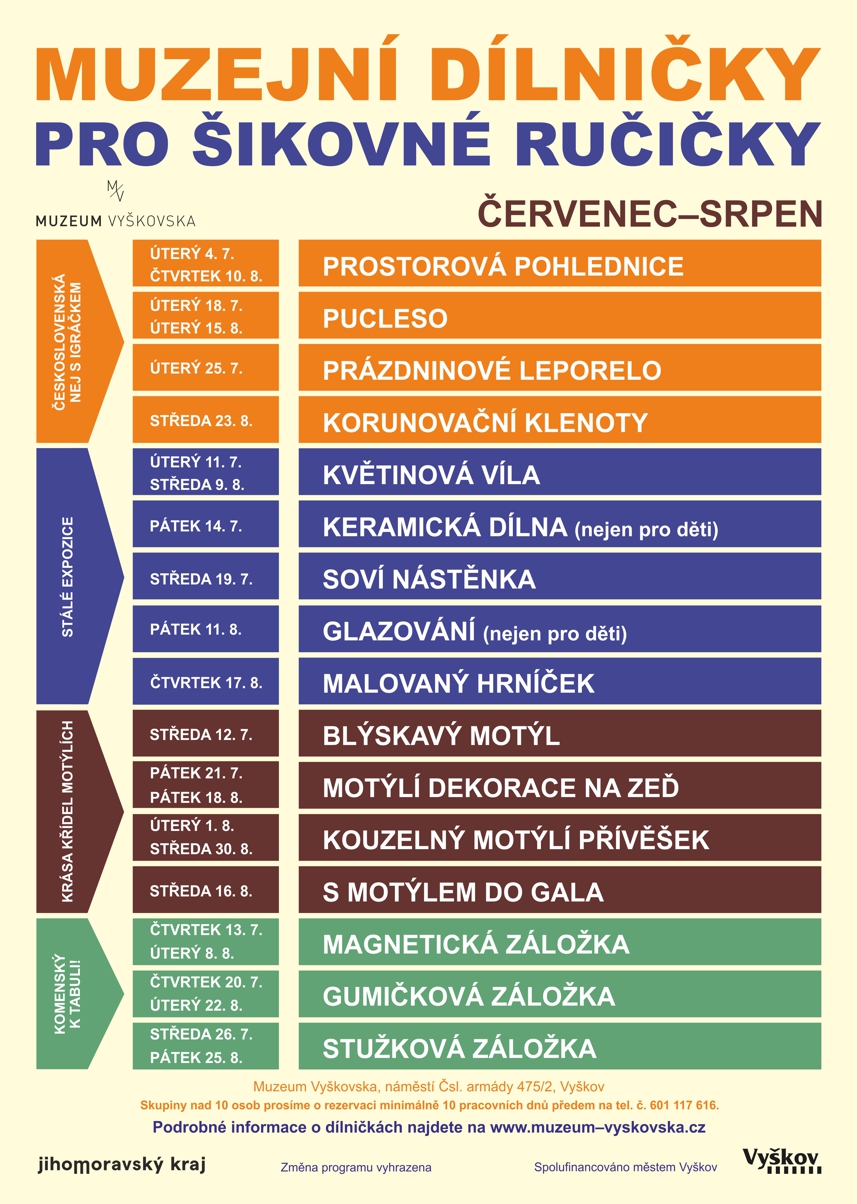 Opět jsou tu letní prázdniny a my pro vás máme připraveny muzejní dílničky pro šikovné ručičky v atraktivním prostředí vyškovského zámku zaměřené především na kreativní tvoření z různých materiálů. Některé dílničky navazují na právě probíhající výstavy (Československá NEJ s Igráčkem, Krása křídel motýlích, Komenský k tabuli!) a některé na stálé expozice. Jsou určeny pro malé i větší děti, zapojit se může i doprovod.