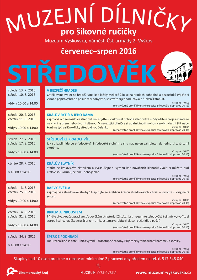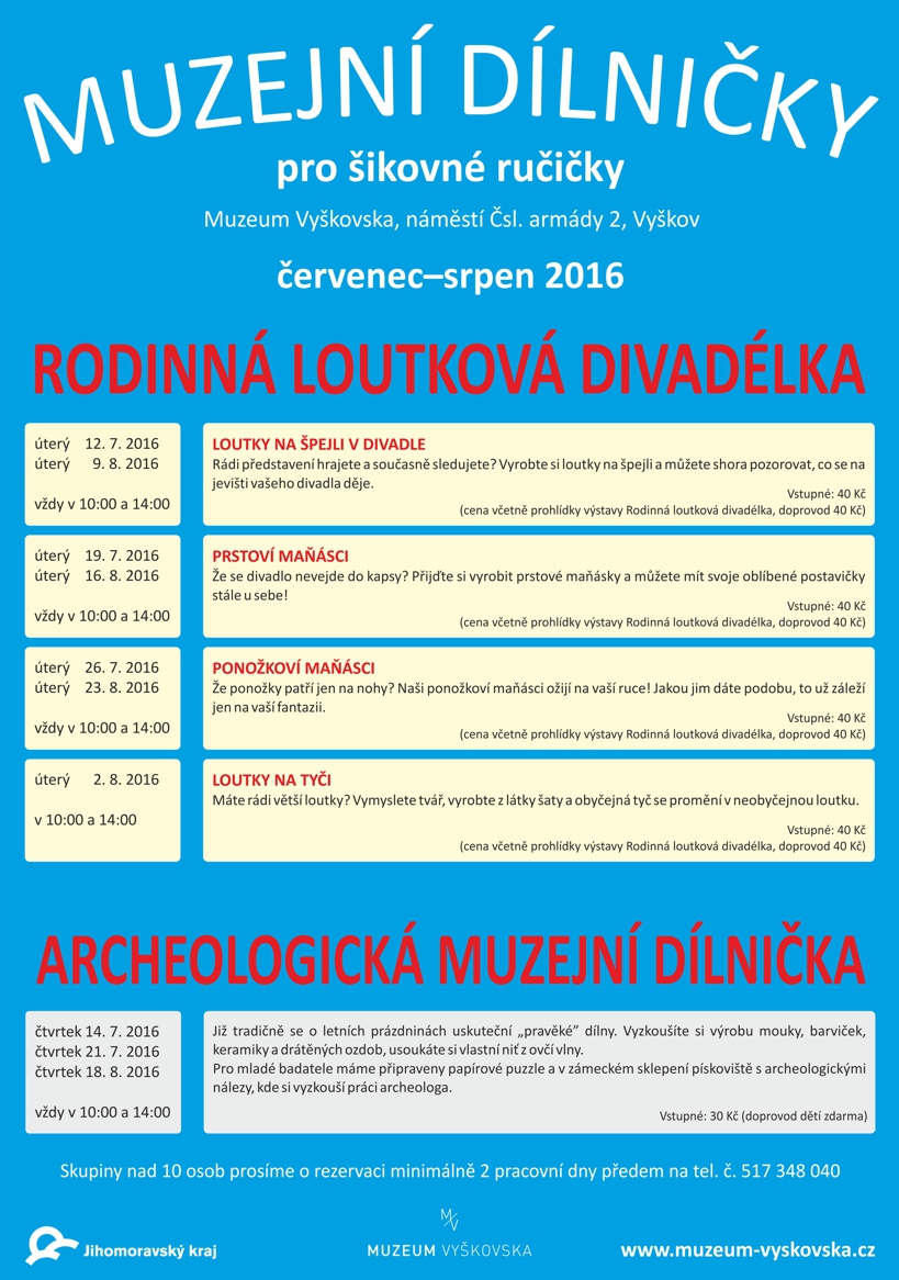 Také v letošním roce jsme na letní prázdniny připravili celou řadu muzejních dílniček pro šikovné ručičky, na které Vás a Vaše děti nebo vnoučata srdečně zveme. Již tradičně se uskuteční Archeologická muzejní dílnička, nové jsou pak dílny zaměřené na středověk a k výstavě Rodinná loutková divadélka. A protože se jedná o tvořivé dílničky, tak si z každé děti odnesou vlastnoručně vytvořený výrobek. Podrobné informace o dílničkách najdete v připojených letácích nebo na našich webových stránkách.