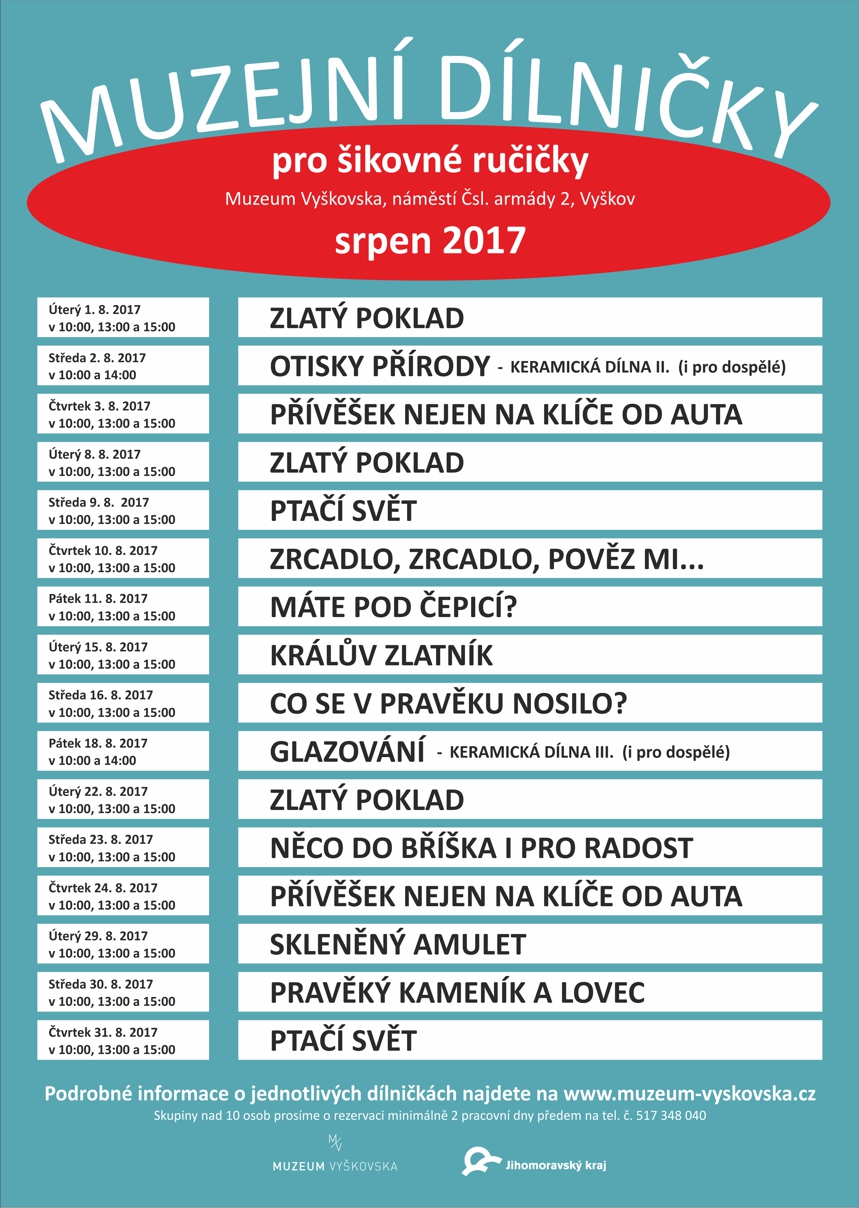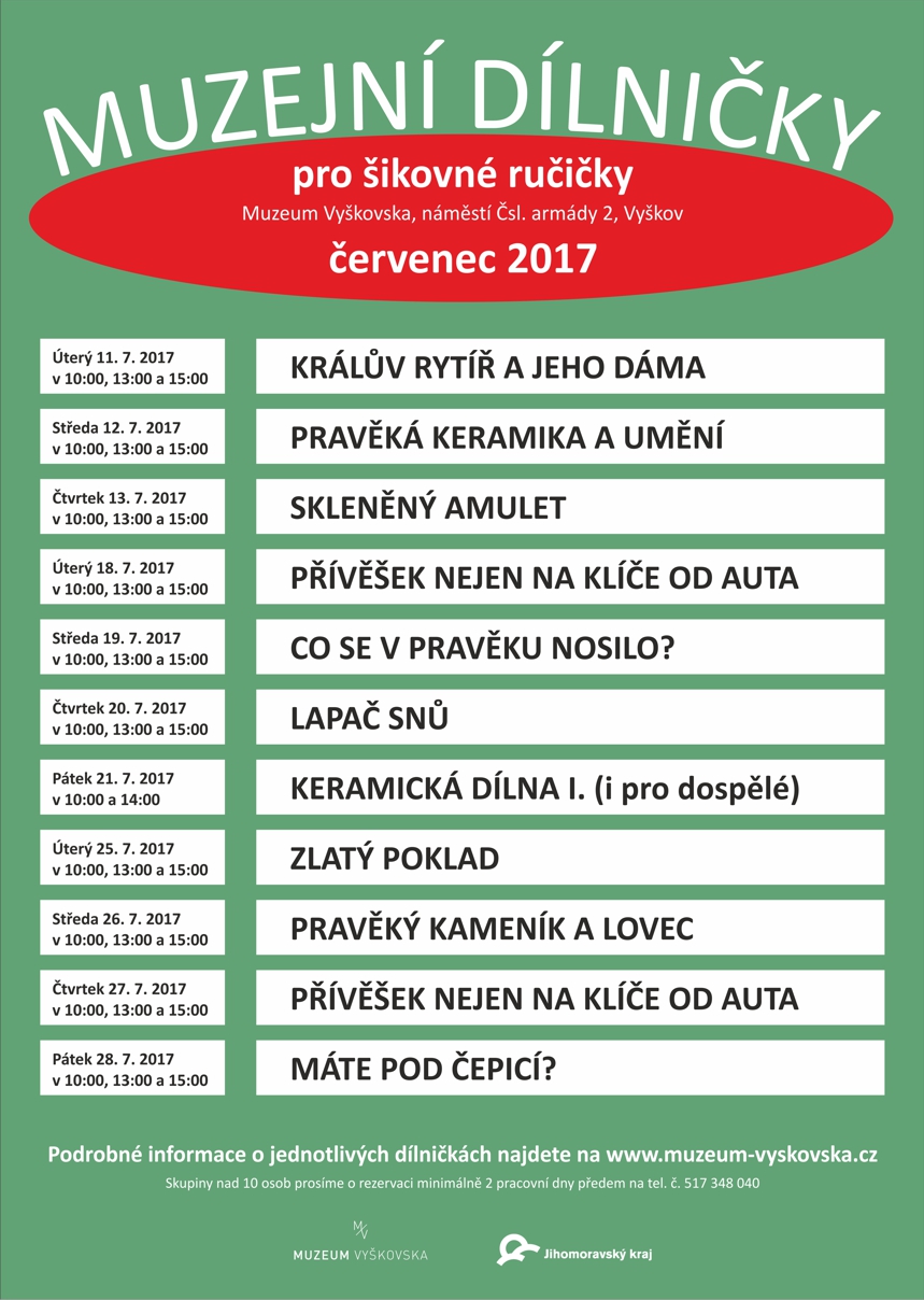 Také v letošním roce jsme na letní prázdniny připravili celou řadu muzejních dílniček pro šikovné ručičky, na které Vás a Vaše děti nebo vnoučata srdečně zveme. Některé dílničky jsou zaměřené na pravěk, středověk, přírodu a keramiku, další pak přímo navazují na probíhající výstavy – Dracula a ti druzí, Brigadýrky, čepice, čáky, přilby, Zámek s vůní benzínu a Poklady císařské Číny. Keramické dílničky jsou vhodné i pro dospělé.
