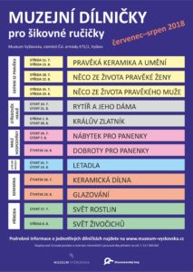 Pro všechny tvořivé děti jsme opět připravili na červenec a srpen celou řadu muzejních dílniček pro šikovné ručičky v atraktivním prostředí vyškovského zámku zaměřené především na kreativní tvoření z různých materiálů. Dílničky jsou určeny pro malé i větší děti, zapojit se může i doprovod. Některé z nich přímo navazují na právě probíhající výstavy (Letecké a jiné modely, Malé hospodyňky).
