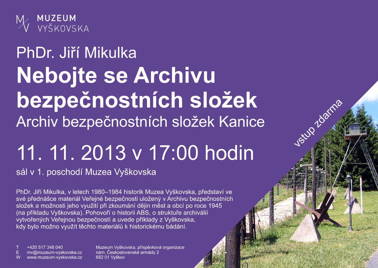 PhDr. Jiří Mikulka, v letech 1980 – 1984 historik Muzea Vyškovska, představí ve své přednášce materiál Veřejné bezpečnosti uložený v Archivu bezpečnostních složek a možnosti jeho využití při zkoumání dějin měst a obcí po roce 1945 (na příkladu Vyškovska). Pohovoří o historii ABS, o struktuře archiválií vytvořených Veřejnou bezpečností a uvede příklady z Vyškovska, kdy bylo možno využít těchto materiálů k historickému bádání.