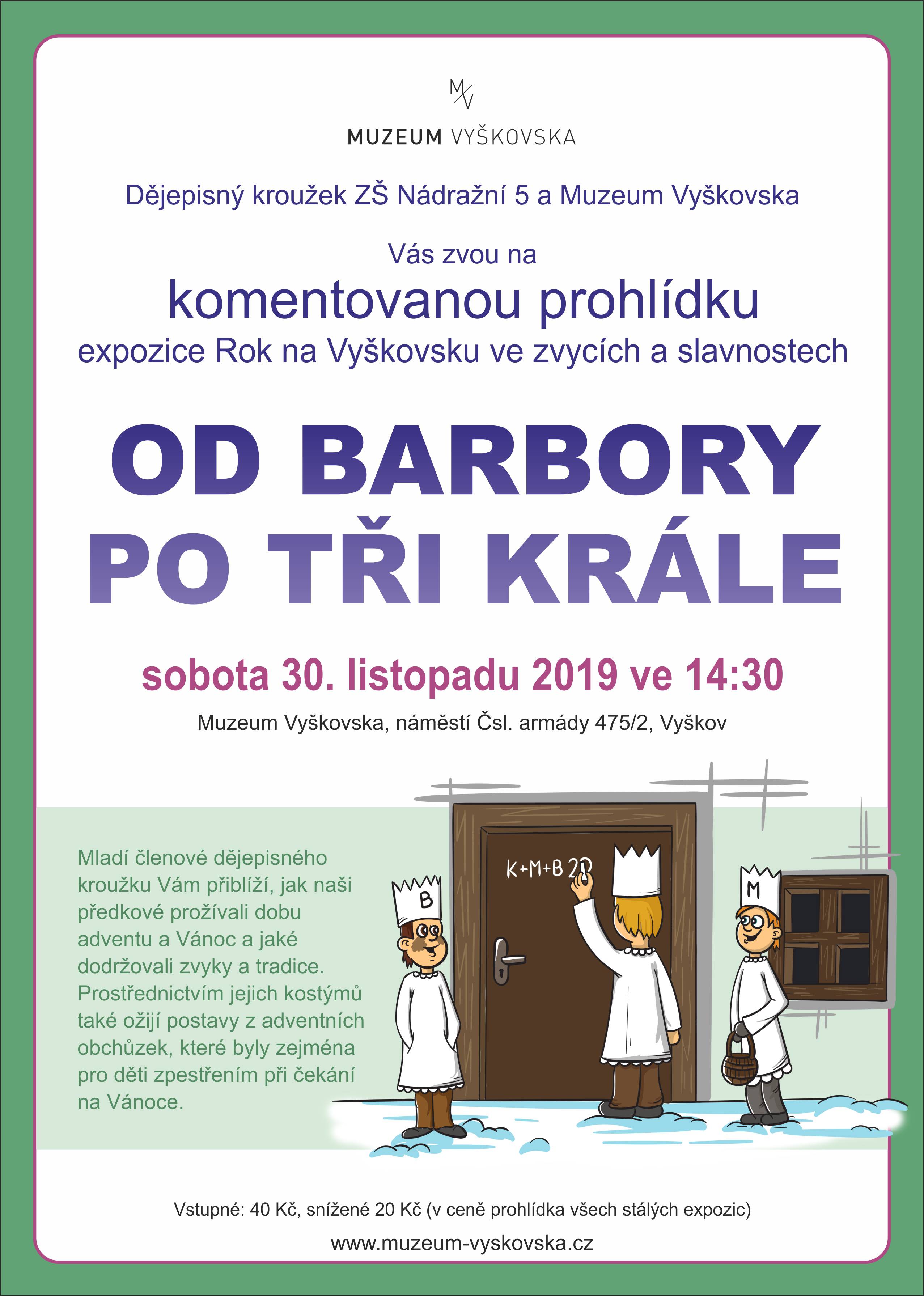 Dějepisný kroužek ZŠ Nádražní 5 a naše muzeum Vás srdečně zvou na komentovanou prohlídku expozice Rok na Vyškovsku ve zvycích a slavnostech. Mladí členové dějepisného kroužku Vám přiblíží, jak naši předkové prožívali dobu adventu a Vánoc a jaké dodržovali zvyky a tradice. Prostřednictvím jejich kostýmů ožijí postavy z adventních obchůzek, které byly zejména pro děti zpestřením při čekání na Vánoce.