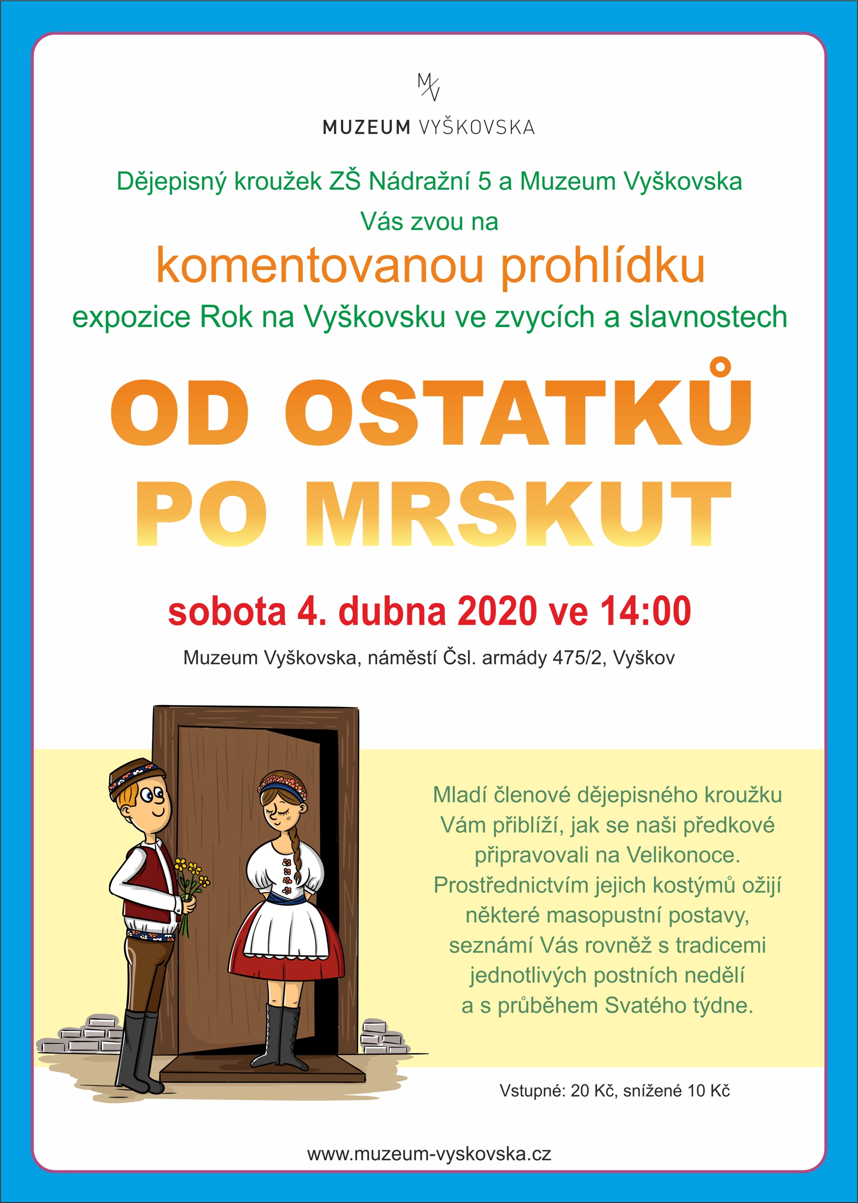 Dějepisný kroužek ZŠ Nádražní 5 a naše muzeum Vás srdečně zvou na komentovanou prohlídku expozice Rok na Vyškovsku ve zvycích a slavnostech. Mladí členové dějepisného kroužku Vám přiblíží, jak se naši předkové připravovali na Velikonoce. Prostřednictvím jejich kostýmů ožijí některé masopustní postavy, seznámí Vás rovněž s tradicemi jednotlivých postních nedělí a s průběhem Svatého týdne.