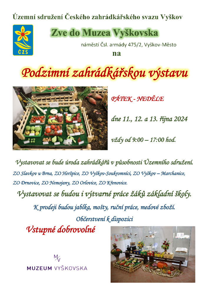 Územní sdružení Českého zahrádkářského svazu Vyškov vás srdečně zve na Podzimní zahrádkářskou výstavu, na které uvidíte úrodu zahrádkářů v působnosti Územního sdružení ZO Slavkov u Brna, ZO Heršpice, ZO Vyškov–Soukromníci, ZO Vyškov – Marchanice, ZO Drnovice, ZO Nemojany, ZO Orlovice, ZO Křenovice.