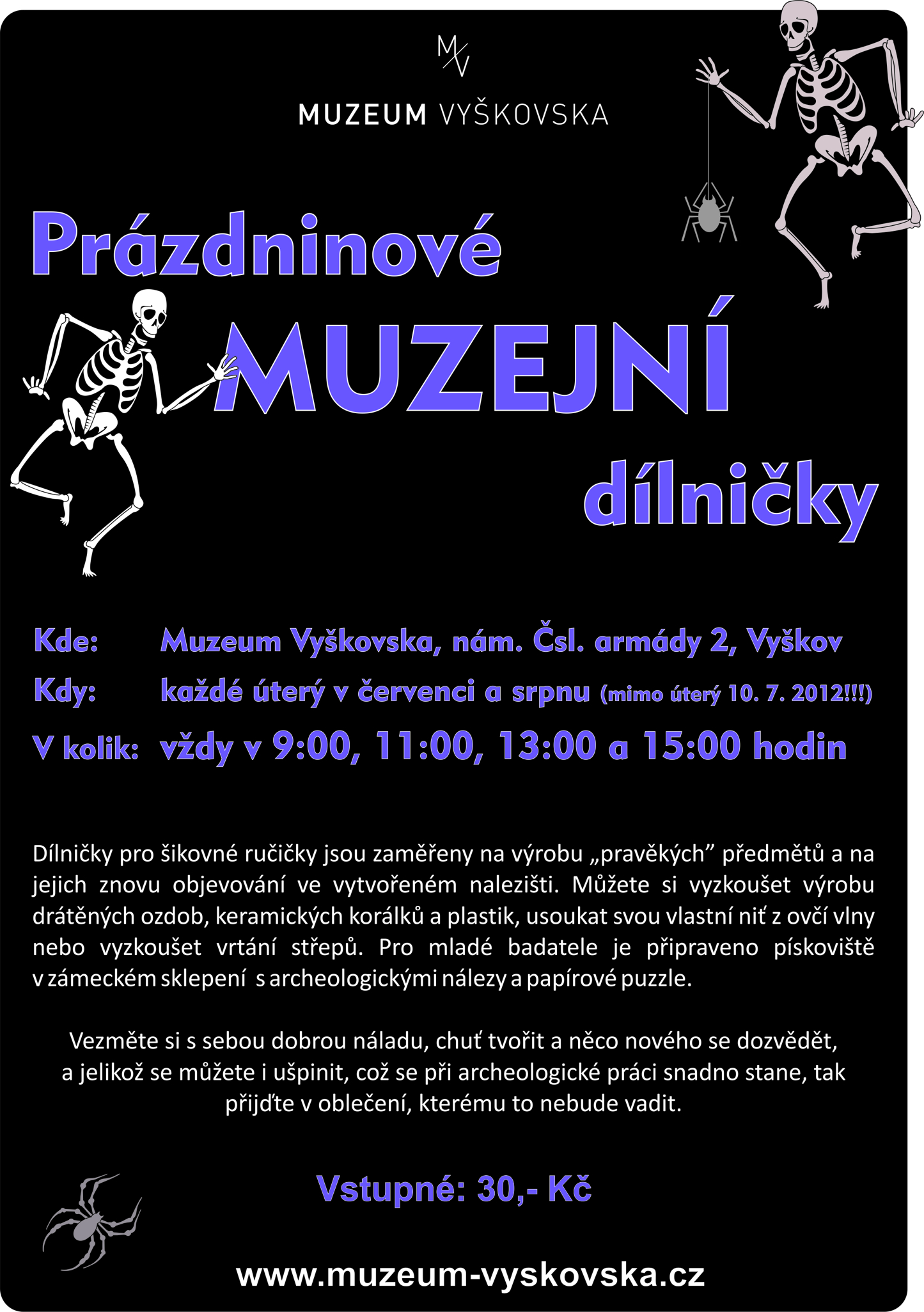 Opět máme pro Vás připraveny Prázdninové muzejní dílničky pro šikovné ručičky zaměřené na výrobu „pravěkých“ předmětů a na jejich znovu objevování ve vytvořeném nalezišti. Můžete si vyzkoušet výrobu drátěných ozdob, keramických korálků a plastik, usoukat svou vlastní niť z ovčí vlny nebo vyzkoušet vrtání střepů. Pro mladé badatele je připraveno pískoviště v zámeckém sklepení s archeologickými nálezy a papírové puzzle.