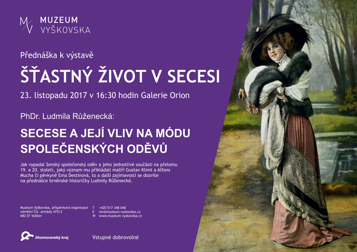 Jak vypadal ženský společenský oděv a jeho jednotlivé součásti na přelomu 19. a 20. století, jaký význam mu přikládali malíři Gustav Klimt a Alfons Mucha či pěvkyně Ema Destinnová, to a další zajímavosti se dozvíte v přednášce brněnské historičky umění Ludmily Růženecké.