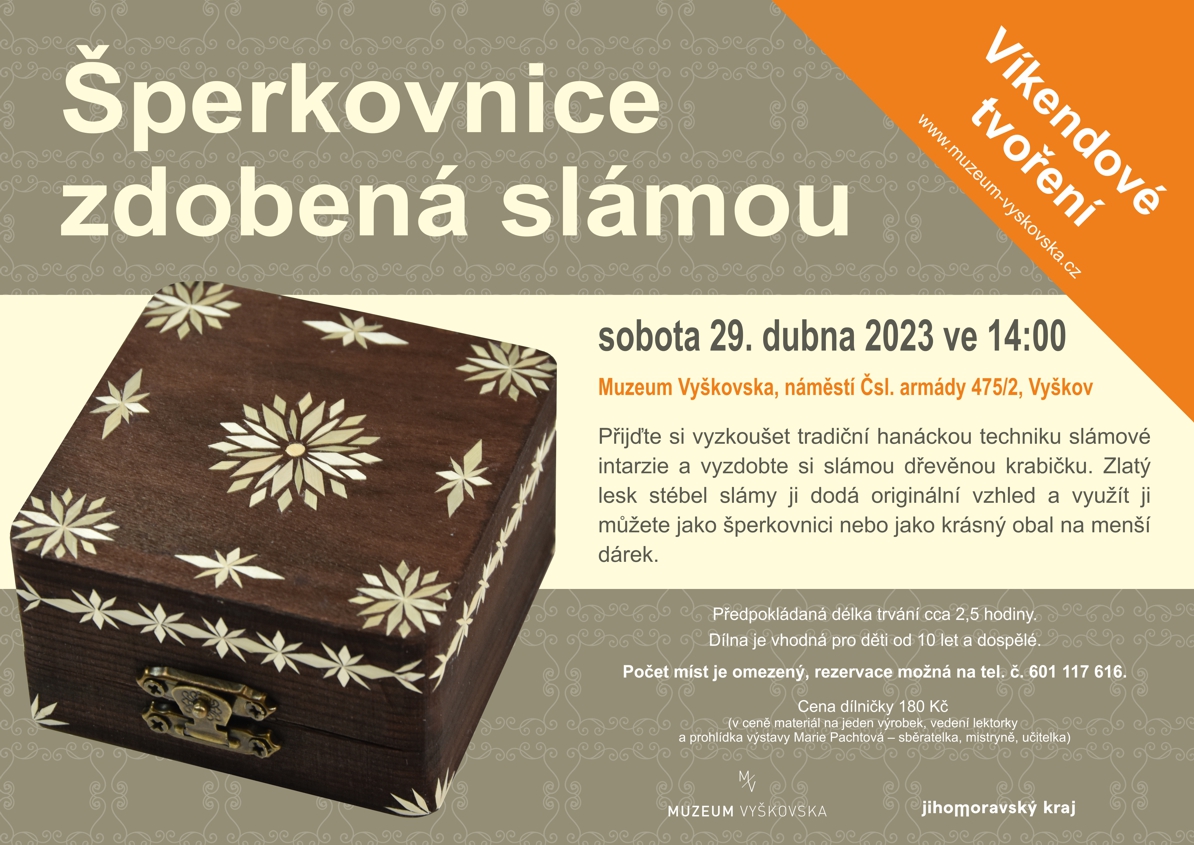Přijďte si vyzkoušet tradiční hanáckou techniku slámové intarzie a vyzdobte si slámou dřevěnou krabičku. Zlatý lesk stébel slámy ji dodá originální vzhled a využít ji můžete jako šperkovnici nebo jako krásný obal na menší dárek.