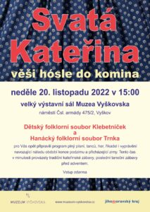 Dětský folklorní soubor Klebetníček a Hanácký folklorní soubor Trnka pro Vás opět připravili program plný písní, tanců, her, říkadel i vyprávění navozující náladu období konce podzimu a přicházející zimy. Tento čas v minulosti provázely tradiční kateřinské zábavy, poslední taneční zábavy před adventem.