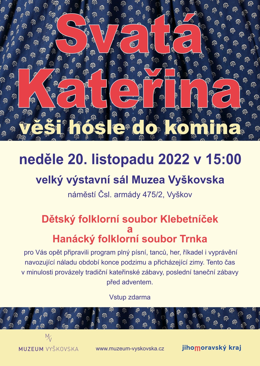 Dětský folklorní soubor Klebetníček a Hanácký folklorní soubor Trnka pro Vás opět připravili program plný písní, tanců, her, říkadel i vyprávění navozující náladu období konce podzimu a přicházející zimy. Tento čas v minulosti provázely tradiční kateřinské zábavy, poslední taneční zábavy před adventem.