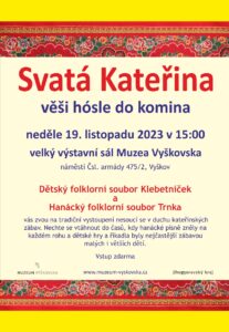Dětský folklorní soubor Klebetníček a Hanácký folklorní soubor Trnka vás zvou na tradiční vystoupení nesoucí se v duchu kateřinských zábav. Nechte se vtáhnout do časů, kdy hanácké písně zněly na každém rohu a dětské hry a říkadla byly nejčastější zábavou malých i větších dětí.