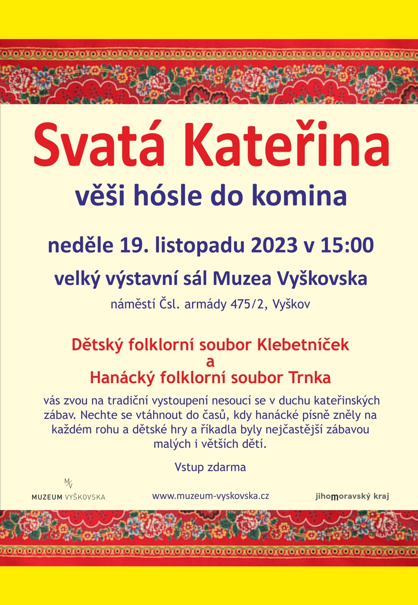 Dětský folklorní soubor Klebetníček a Hanácký folklorní soubor Trnka vás zvou na tradiční vystoupení nesoucí se v duchu kateřinských zábav. Nechte se vtáhnout do časů, kdy hanácké písně zněly na každém rohu a dětské hry a říkadla byly nejčastější zábavou malých i větších dětí.