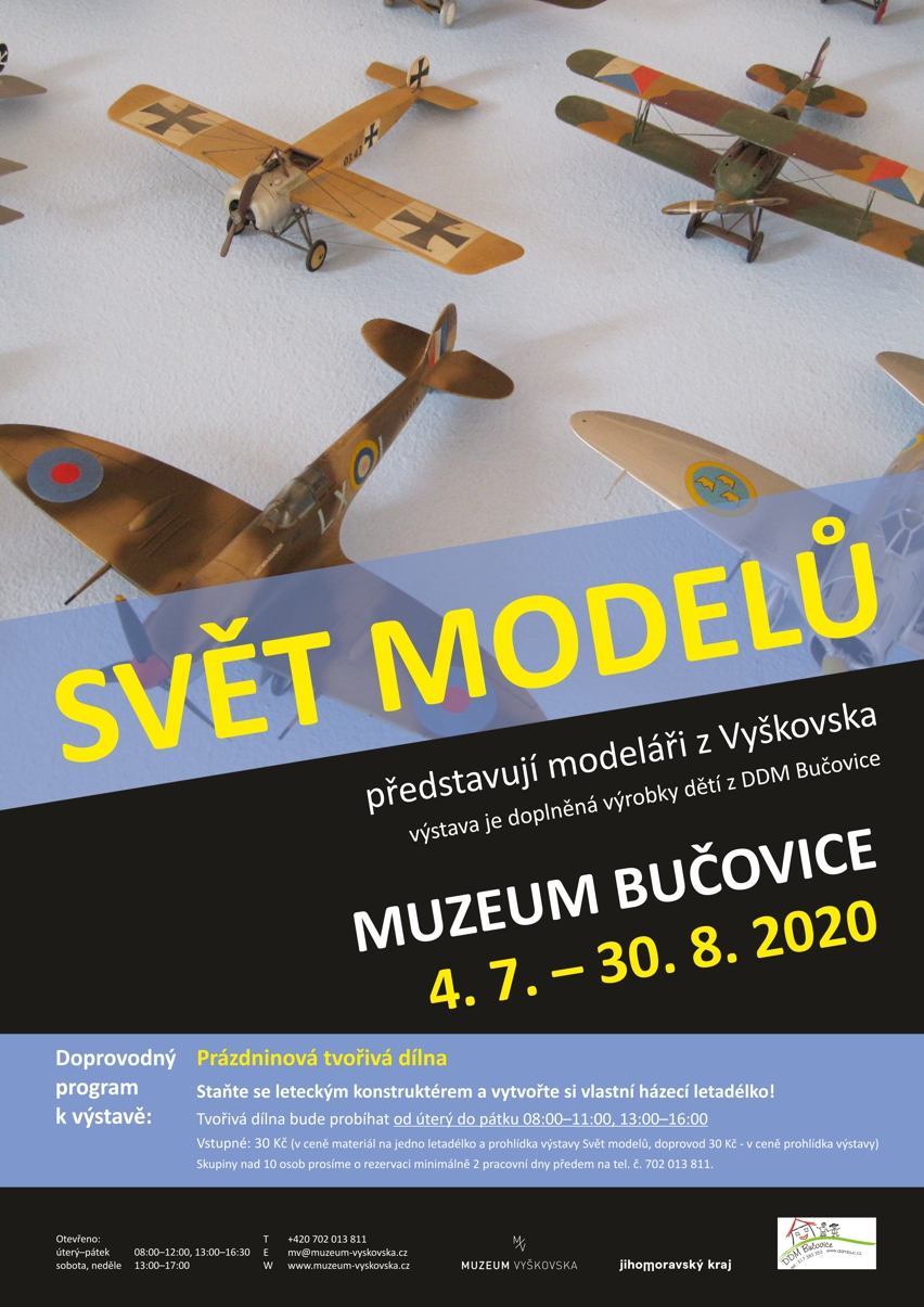 Modelářství je nejen koníčkem jdoucím skrze generace, ale také činností, při níž musí být člověk obdařen zručností, trpělivostí a smyslem pro detail. To vše je vlastní skupině modelářů z Vyškovska, kteří své výtvory sestavují již desítky let nebo se této zábavě věnují celoživotně. Své modely vystaví nejen členové Hanáckého klubu plastikových modelářů, ale také další amatérští modeláři, kteří své „poklady“ dosud veřejně neprezentovali. Modely především vojenských letadel a bojové techniky nyní představí v Muzeu Bučovice. Návštěvníci si prohlédnou výtvory nejen plastové, ale také z balzového dřeva nebo z papíru. K vidění budou statické modely různých velikostí, ale také funkční letadla s RC ovládáním.