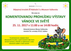 Dějepisný kroužek ZŠ Nádražní 5 a naše muzeum Vás zvou na komentovanou prohlídku výstavy Vánoce ve světě. Prostřednictvím mladých členů dějepisného kroužku a jejich kostýmů ožijí různé vánoční postavy a dozvíte se zajímavosti z oslav vánočních svátků v cizích zemích.
