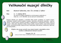 Muzejní dílničky pro základní a mateřské školy a zájmové kolektivy budou zaměřeny na tvoření kraslic, vyzkoušení různých technik zdobení (voskem, bavlnkou, přírodními materiály – kopřiva, cibule). Tvoření prolne zajímavé povídání o Velikonocích a jednotlivých dnech, které je provází – Velký půst, Popeleční středa, Postní neděle, Smrtná neděle, Svatý týden (Květná neděle, Sazometná středa, Zelený čtvrtek, Velký pátek, Bílá sobota), Velikonoce, Boží hod, Červené pondělí…