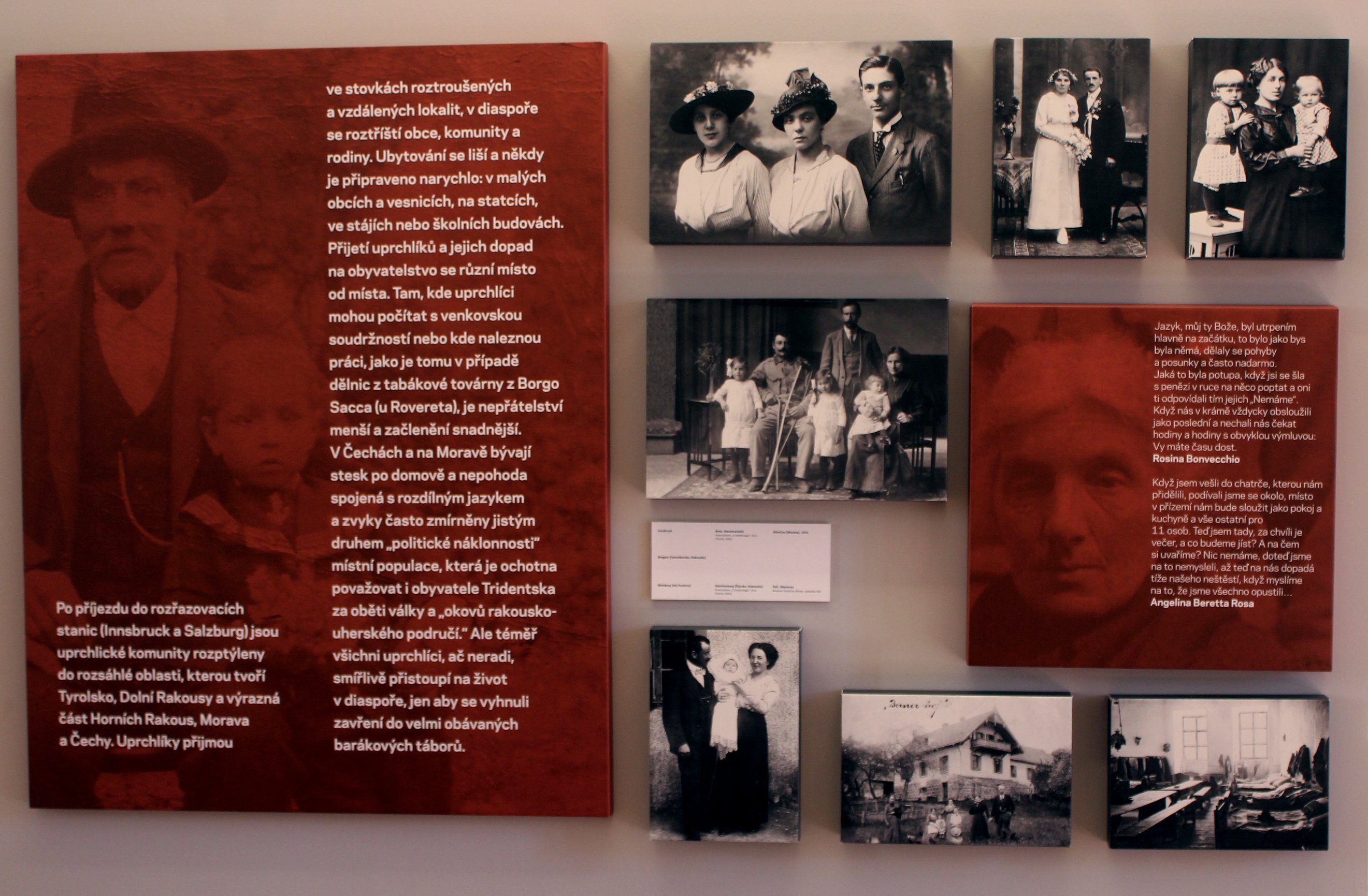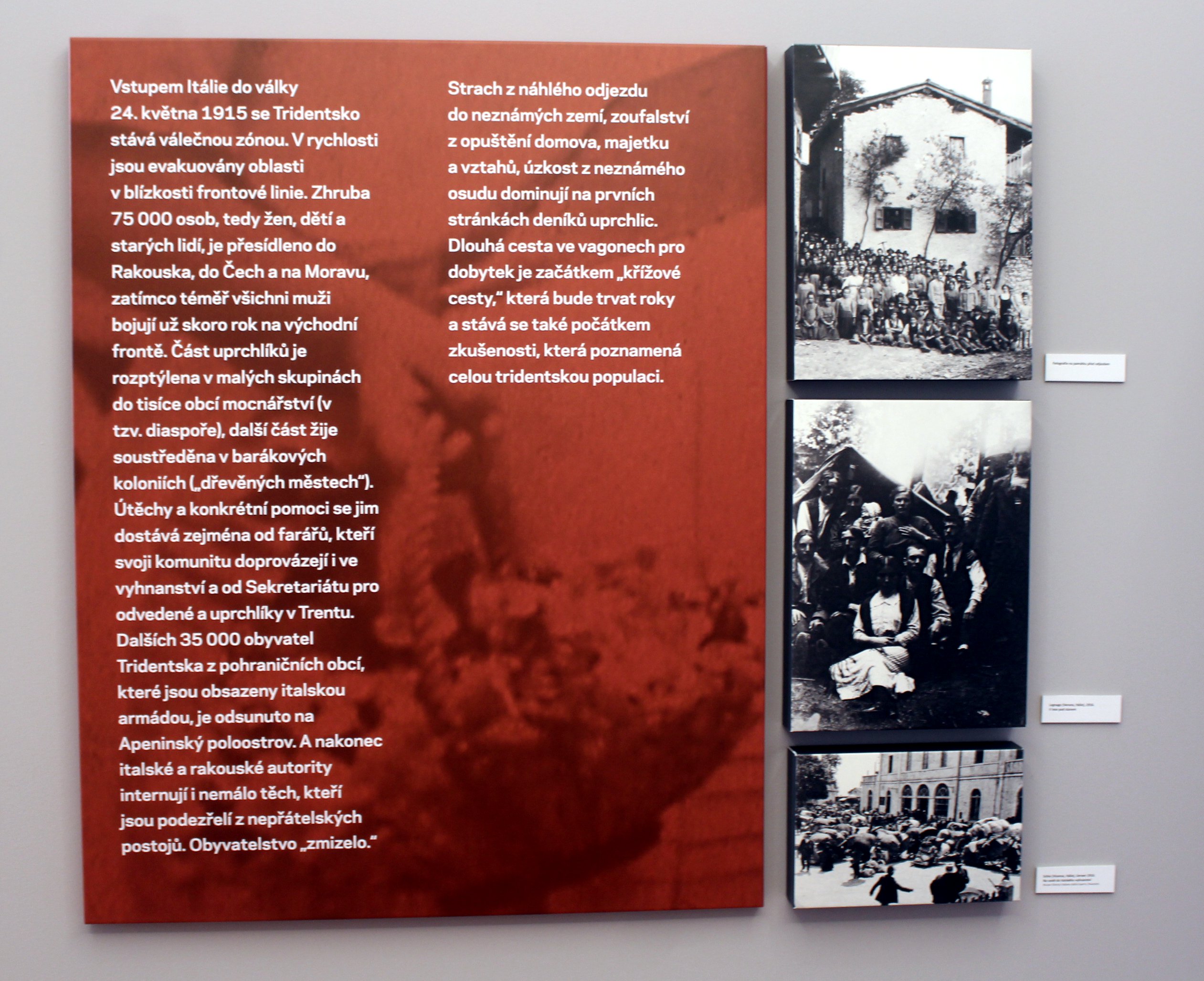 Výstava připravená italskými odborníky pod názvem „Gli spostati – Profughi, Flüchtlinge, Uprchlíci“ představuje nepříliš známou kapitolu Velké války, která se dotkla i historie rodin a obcí v Čechách a na Moravě. Dne 24. května 1915 Itálie vypovídá válku Rakousku-Uhersku a do zázemí mocnářství, tedy do českých, moravských a rakouských obcí a barákových kolonií, je evakuováno více než 70 tisíc obyvatel Trentina, tehdejší rakouské provincie. Jihotyrolští uprchlíci zůstanou v exilu ve velké většině až do konce světového konfliktu a zážitky a vzpomínky na tuto dramatickou epizodu svého života si od té doby předávají z generace na generaci. Součástí výstavy jsou dobové fotografie, doprovodné texty, úryvky z deníků a dopisů, mapy a cestovní truhly, které se staly symbolem tridentských uprchlíků.