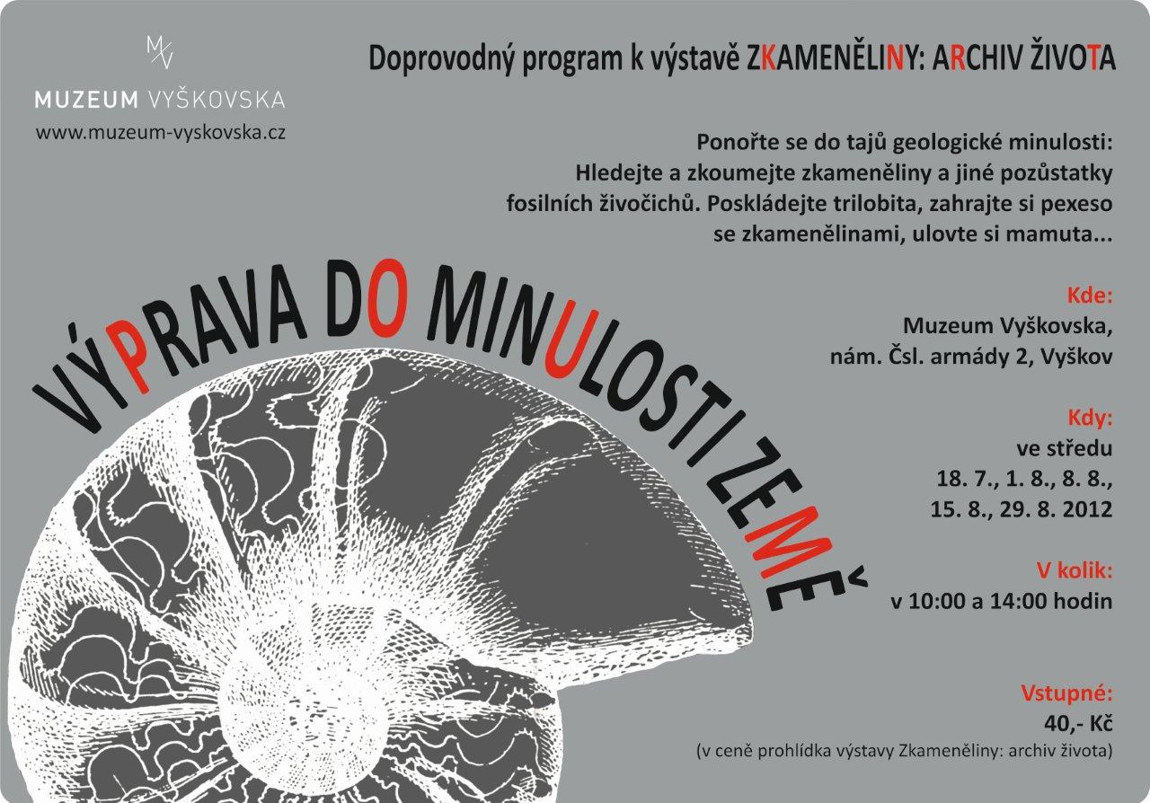 Pracovníci Muzea Vyškovska pro Vás připravili doprovodný program Výprava do minulosti Země k právě probíhající výstavě Zkameněliny: archiv života. Budete mít možnost ponořit se do tajů geologické minulosti: hledat a zkoumat zkameněliny a jiné pozůstatky fosilních živočichů, poskládat trilobita, zahrát si pexeso se zkamenělinami, ulovit si mamuta…
