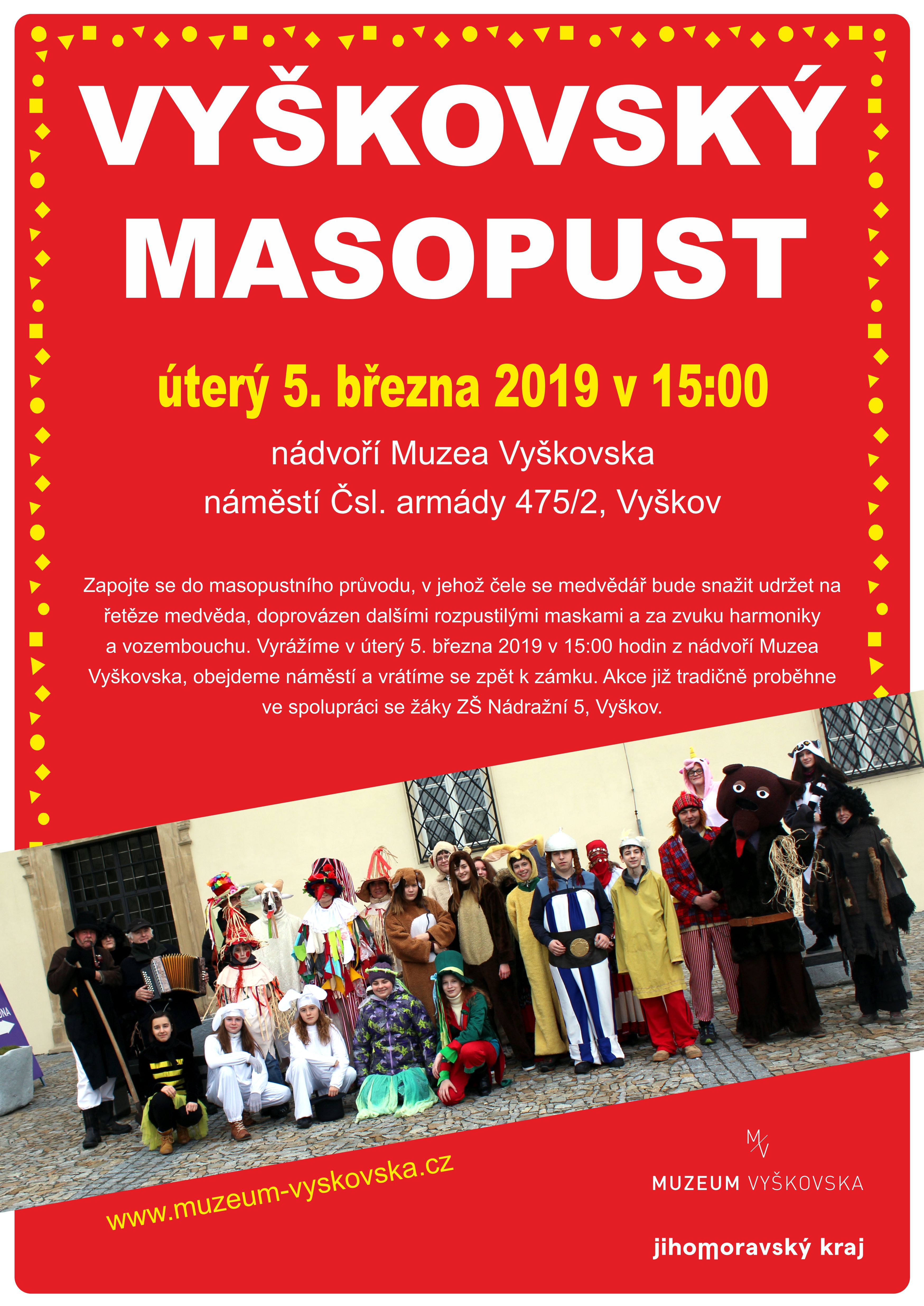 Zapojte se do masopustního průvodu, v jehož čele se medvědář bude snažit udržet na řetěze medvěda, doprovázen dalšími rozpustilými maskami a za zvuku harmoniky a vozembouchu. Vyrážíme v úterý 5. března 2019 v 15:00 hodin z nádvoří Muzea Vyškovska, obejdeme náměstí a vrátíme se zpět k zámku.