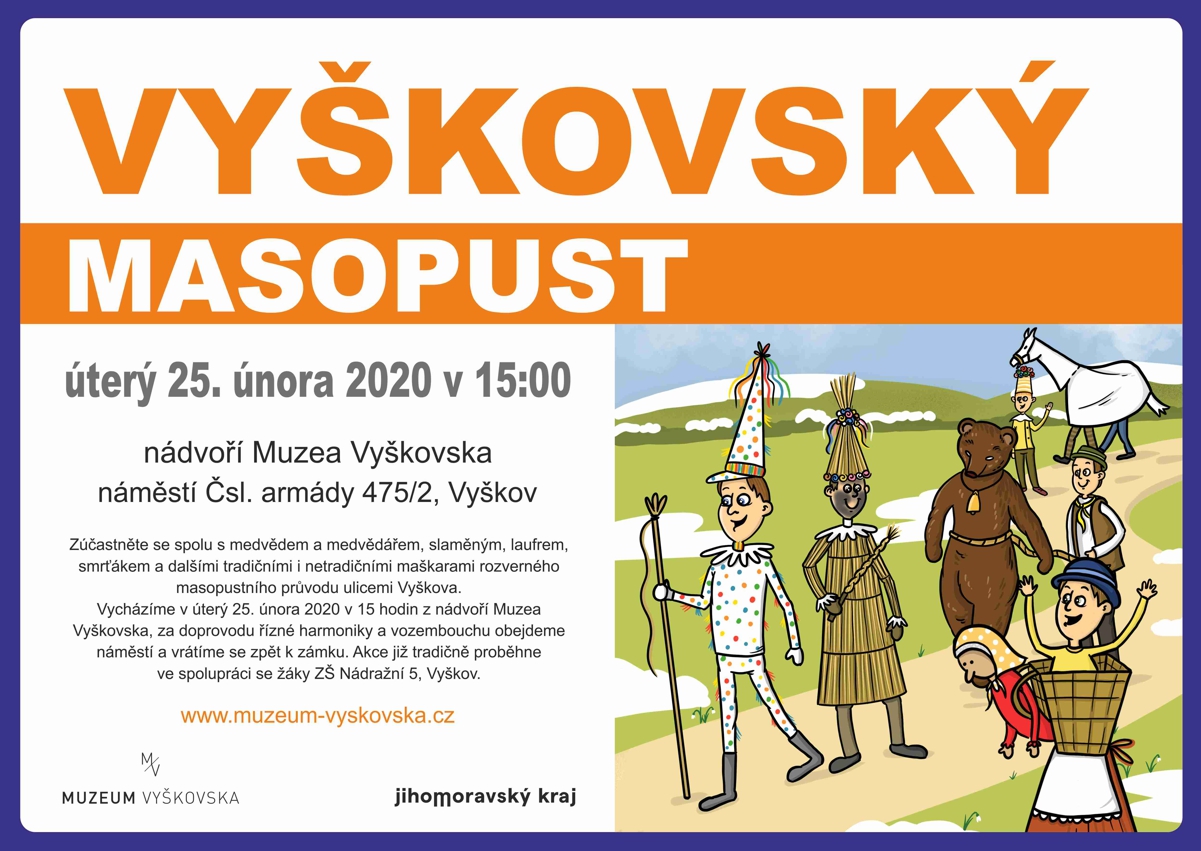 Zúčastněte se spolu s medvědem a medvědářem, slaměným, laufrem, smrťákem a dalšími tradičními i netradičními maškarami rozverného masopustního průvodu ulicemi Vyškova. Vycházíme v úterý 25. února 2020 v 15 hodin z nádvoří Muzea Vyškovska, za doprovodu řízné harmoniky a vozembouchu obejdeme náměstí a vrátíme se zpět k zámku. Akce se uskuteční ve spolupráci se ZŠ Nádražní 5, Vyškov.