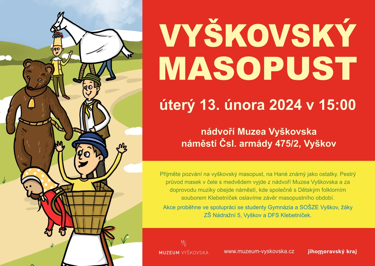 Přijměte pozvání na vyškovský masopust, na Hané známý jako ostatky. Pestrý průvod masek v čele s medvědem vyjde v úterý 13. února 2024 v 15 hodin z nádvoří Muzea Vyškovska a za doprovodu muziky obejde náměstí, kde společně s Dětským folklorním souborem Klebetníček oslavíme závěr masopustního období.