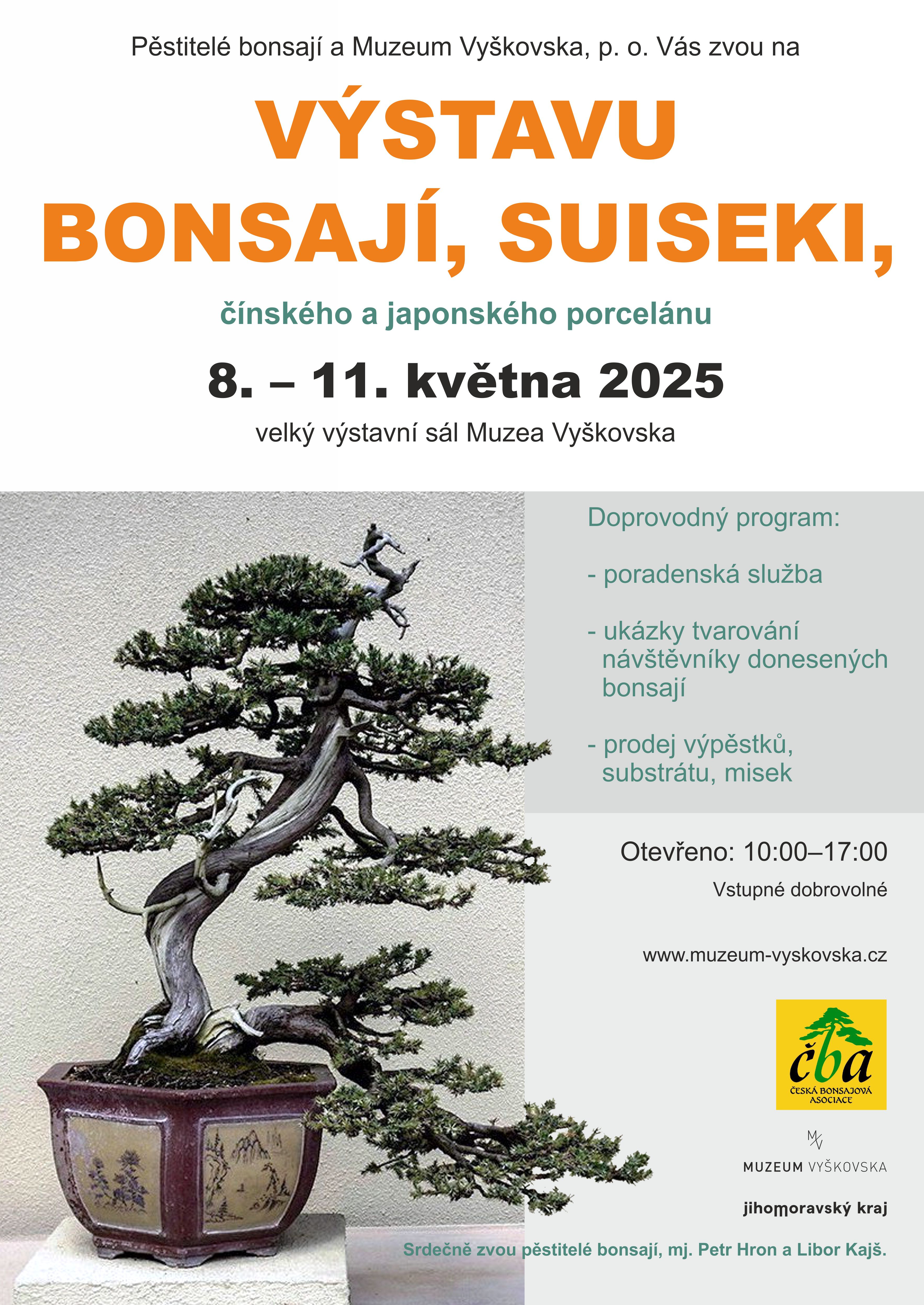 Pěstitelé bonsají a naše muzeum Vás srdečně zvou na výstavu bonsají, suiseki, čínského a japonského porcelánu. Součástí výstavy bude i poradenská služba, ukázky tvarování návštěvníky donesených bonsají a prodej výpěstků, substrátu a misek.