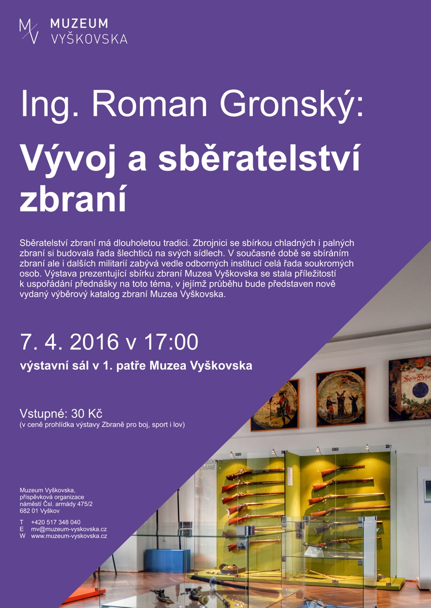 Výstava prezentující sbírku zbraní Muzea Vyškovska se stala příležitostí k uspořádání přednášky na toto téma, v jejímž průběhu bude představen nově vydaný výběrový katalog zbraní Muzea Vyškovska.