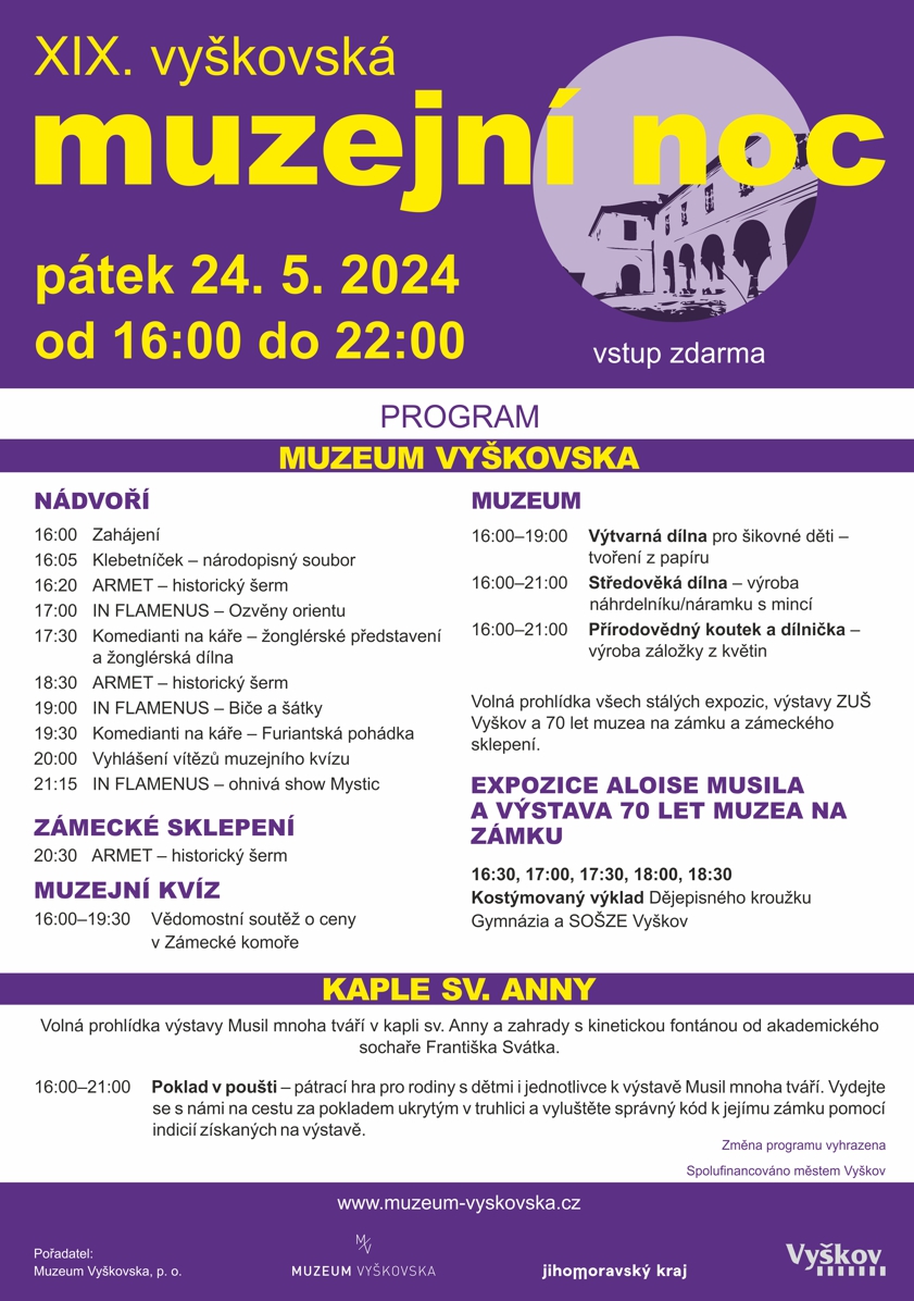 v pátek 24. května 2024 od 16:00 do 22:00 hodin Muzeum Vyškovska a kaple sv. Anny