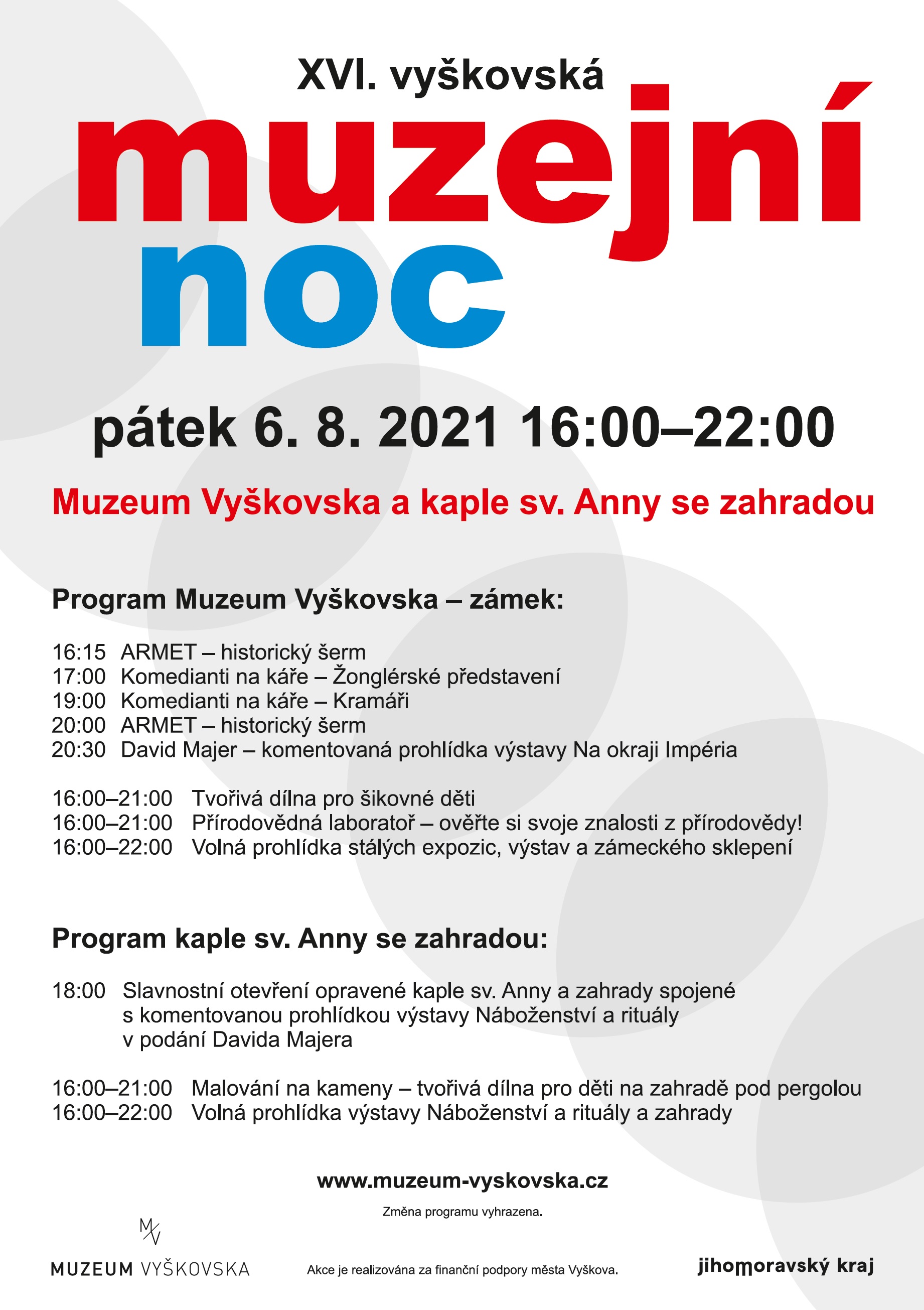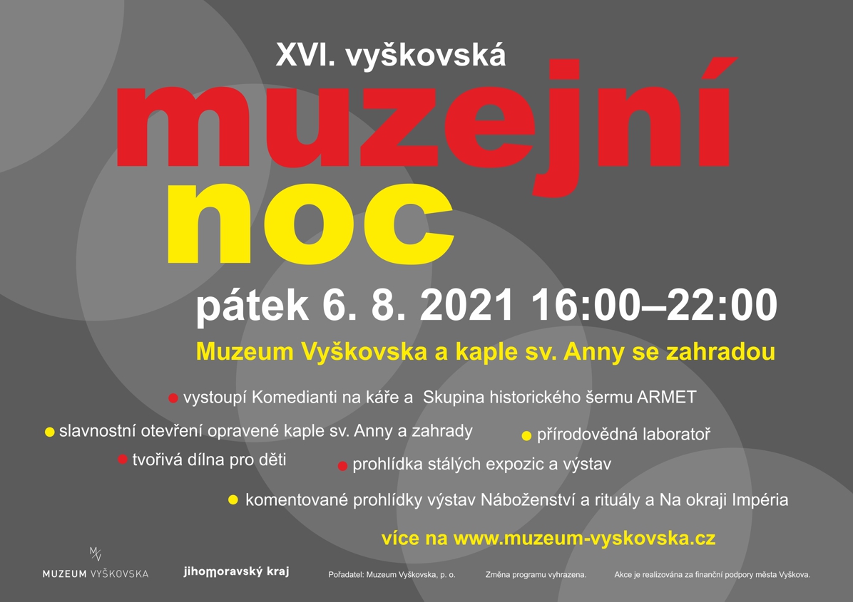 Zveme Vás srdečně na vyškovskou muzejní noc, která se v letošním roce uskuteční nejen v Muzeu Vyškovska, ale i v kapli sv. Anny. Kromě stálých expozic, výstav a zámeckého sklepení u nás v průběhu odpoledne a večera uvidíte dvě vystoupení Komediantů na káře a skupiny historického šermu ARMET. Pro dětské návštěvníky máme připraveny tvořivé aktivity, pro dospělé komentované prohlídky výstav.