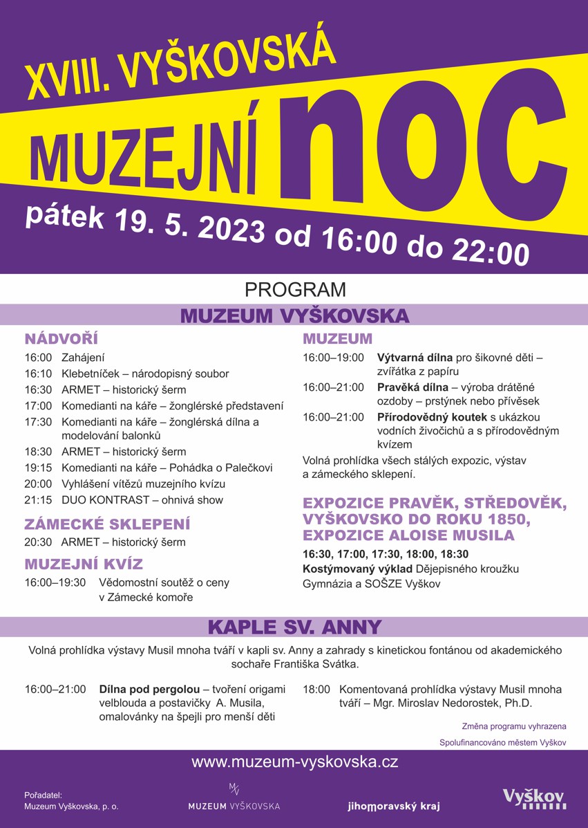 pátek 19. května 2023 od 16:00 do 22:00 hodin Muzeum Vyškovska a kaple sv. Anny